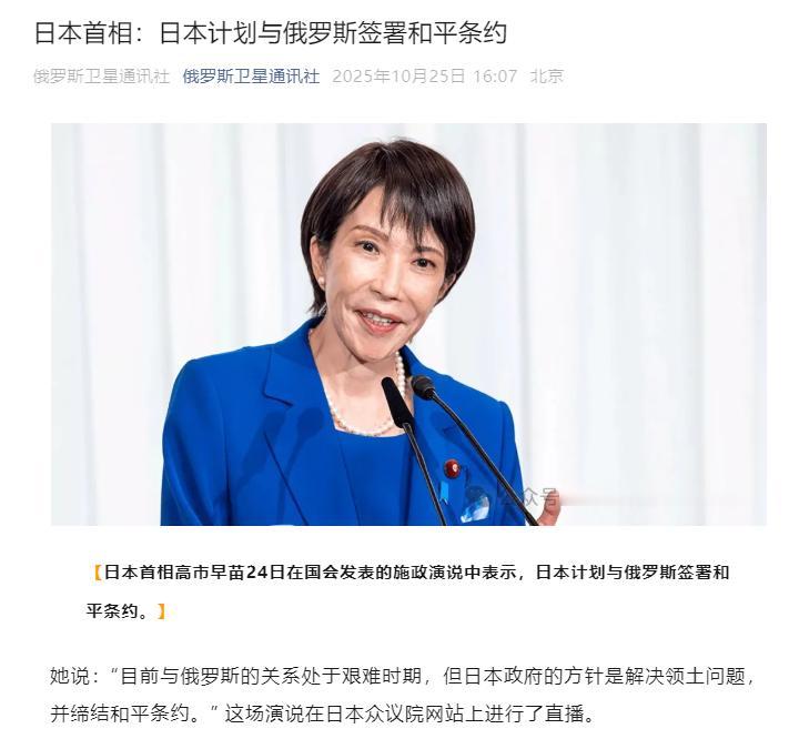日本新首相高市早苗刚把首相宝座坐热没几天,就抛出个让全网炸锅的消息,她明明白白的表示接下来要跟俄罗斯签和平条约。 要知道俄日这关系僵了几十年就没松过劲,现在突然提这茬难不成真要“破冰”了。 结果这股期待的热乎劲还没焐热,克里姆林宫发言人佩斯科夫就出来泼了冷水。   其实这事儿压根不算新鲜,俄日要签和平条约的事儿,打二战结束就没顺当过,一直卡壳,根子全在北海道东北边那四座小岛身上。日本管这四座岛叫“北方四岛”,俄罗斯却叫“南千岛群岛”,别看俩国各叫各的,就差俩字,背后争的可是实实在在的主权,这岛到底归谁,俩国吵了几十年都没个结果。   早在1945年雅尔塔会议上,美英就跟苏联承诺,把整个千岛群岛都划给苏联。后来日本战败,苏联红军趁着机会就把这四座岛拿下来了,从那以后,这几座岛就成了俄日外交上解不开的死结,谁都不肯松口。   说起来这岛的归属,还有段挺长的拉扯史。远在1855年,俄日就签过条约,把千岛群岛劈成两半,南边的归日本;后来俩国家又拿库页岛做交换,日本借着这机会,把整个千岛群岛都弄到手了。   可沙俄后来输了日俄战争,库页岛也丢了,心里一直憋着股劲儿,直到二战才总算把这口气顺过来,把岛又拿回来了。现在俄罗斯攥着这几座岛不放,靠的就是二战后的国际协议,人家明明白白说:“这是反法西斯战争的结果,岛的主权没任何可争的。”   可日本不这么想啊,从冷战那会儿起,就老翻旧账,靠着美国给它撑腰,一直想把岛要回去。之前安倍晋三当首相的时候,为了这事儿跟普京谈了二十多回,还喊着“战后外交总清算”的口号,想借着签和平条约摆脱战败国的名头,结果谈来谈去,啥好处都没捞着。   现在高市早苗又提这事儿,说白了还是老套路,想靠领土问题刷点政治存在感。毕竟要是哪个首相能解决俄日这“世纪难题”,在日本政坛绝对能留下名儿,这算盘打得挺响。   但俄罗斯这边早就把话说明白了,佩斯科夫泼冷水不是没道理。俄方一直坚持“先签条约,别的事儿再慢慢谈”,可日本偏不,非要把“还岛”当成签条约的前提,这就等于把路堵死了,根本没法谈。更何况俄罗斯早就把这几座岛当成了战略要地,从2012年起就往岛上建军事设施、部署导弹,那意思明摆着:“这地儿我占定了,别想拿走。”   之前俩国家也试过找个折中办法,比如一起开发这几座岛。普京还专门提过这事儿,日本也派了商务团去谈,本来看着有戏,结果日本国会转头就通过个法案,明明白白说“北方四岛是日本本来就有的领土”。   这一下直接把俄罗斯惹火了,说日本破坏双方的共识,之前谈的合作自然也就黄了。现在高市早苗连这些铺垫都没有,上来就喊着要签条约,俄罗斯能给好脸色才怪。   说到底,这事儿还是绕不开二战的历史定论。俄罗斯老早就强调,日本要这几座岛,本质上就是想改二战的结果,这可不只是领土问题,更是俩国历史观的分歧。高市早苗现在就想靠一句“签和平条约”的口号就打破僵局,明显是把这几十年的死结想太简单了。   佩斯科夫这盆冷水,其实就是给全世界提个醒,只要南千岛群岛(日本叫北方四岛)的主权争议没解决,俄日想签和平条约,就永远是看着美、摸不着的事儿。