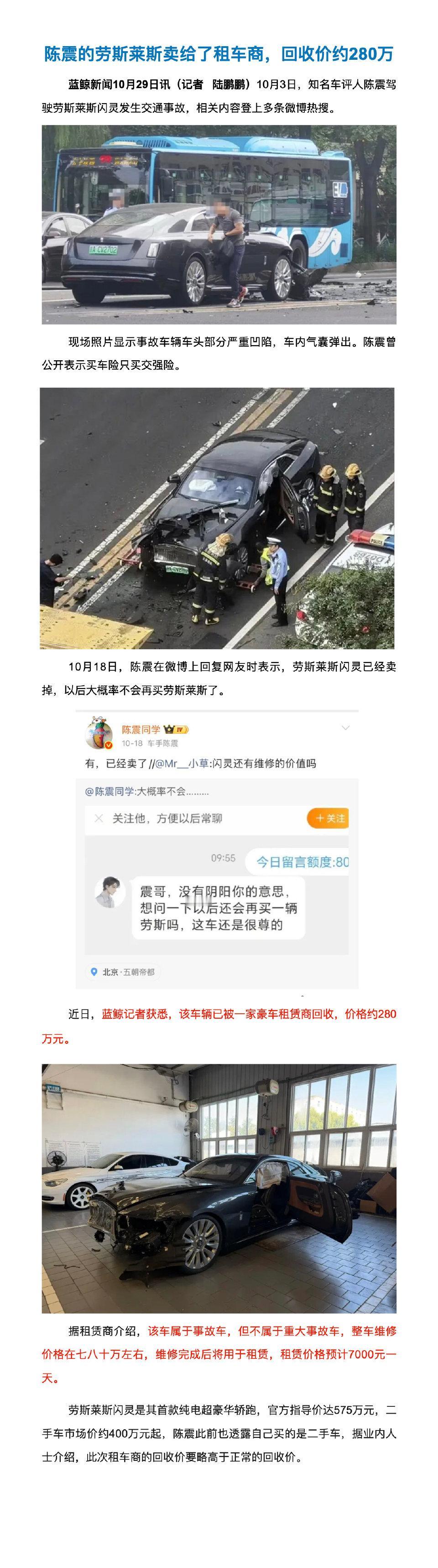 280万!陈震那台撞废的劳斯莱斯闪灵,最后竟被租赁公司接盘了。 这事说起来还挺
