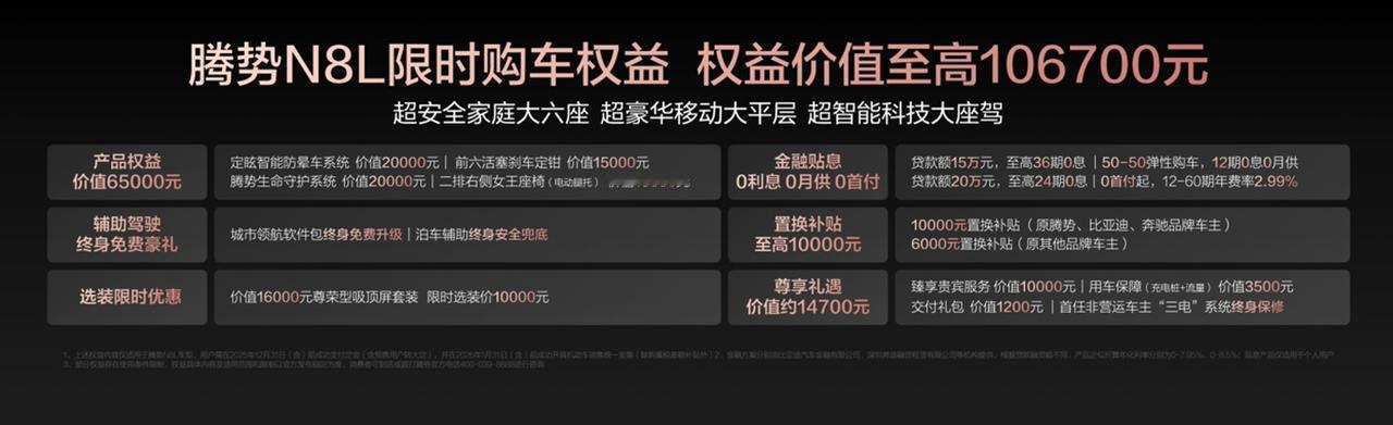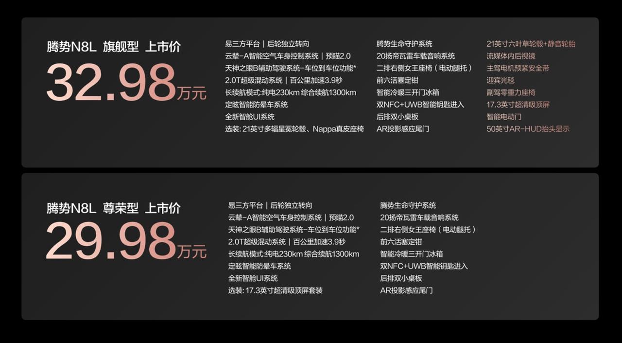 大六座SUV新能源SUV可真是太卷了。29.98万-32.98万元,腾势N8L的价格也是够拼的。这车配置是可以的,易三方,2.0T+三电机插混,六活塞定钳,后轮独立转向(4.58米),云辇-A,CLTC纯电续航里程230km,腾势还发布了专属IP形象。两款配置的话,建议选3298的,兄弟们觉得N8L这次有诚意吗?【来自懂车帝车友圈】
