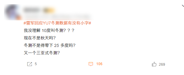 【网友质疑小米YU7冬测界定标准】10月25日,转发了媒体的准冬测数据:“小米YU7续航里程和达成率均是第一,续航干到了687公里,续航达成率是83.6%,超越了竞品特斯拉Model Y。” 评论区有网友提问:有没有小字。雷军回复了8个“[doge]”表情包。同时,也有网友对“冬测”的界定标提出质疑,北京天气10度左右,应该叫秋测。雷军回应YU7冬测数据有没有小字 中国新能源车以创新引领全球产业