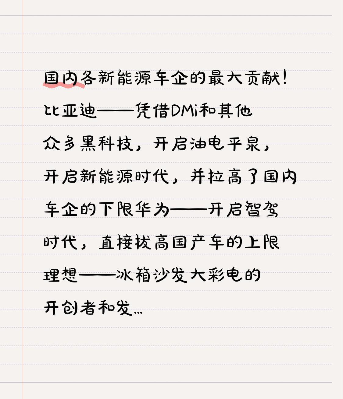 国内各新能源车企的最大贡献! 比亚迪——凭借DMi和其他众多黑科技,开启油电平泉,开启新能源时代,并拉高了国内车企的下限 华为——开启智驾时代,直接拔高国产车的上限 理想——冰箱沙发大彩电的开创者和发扬增程技术的先驱 蔚来——换电模式 小鹏 ——国内最早押注全栈自研智能驾驶的车企之一 长城——跟随比亚迪拉高国产车下限 吉利——跟随比亚迪拉高国产车下限 奇瑞——跟随比亚迪拉高国产车下限 长安——跟随比亚迪拉高国产车下限 北汽——跟随比亚迪拉高国产车下限 上汽——灵魂论 广汽——11:0 零跑——至高性价比的开创者 小米——现象级米氏营销