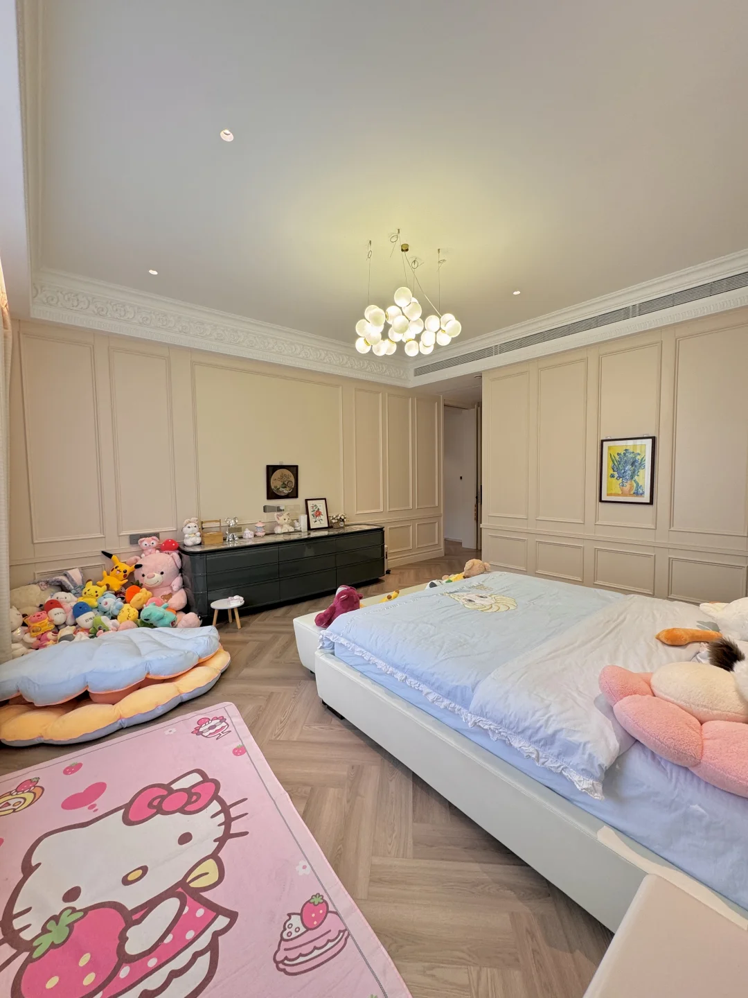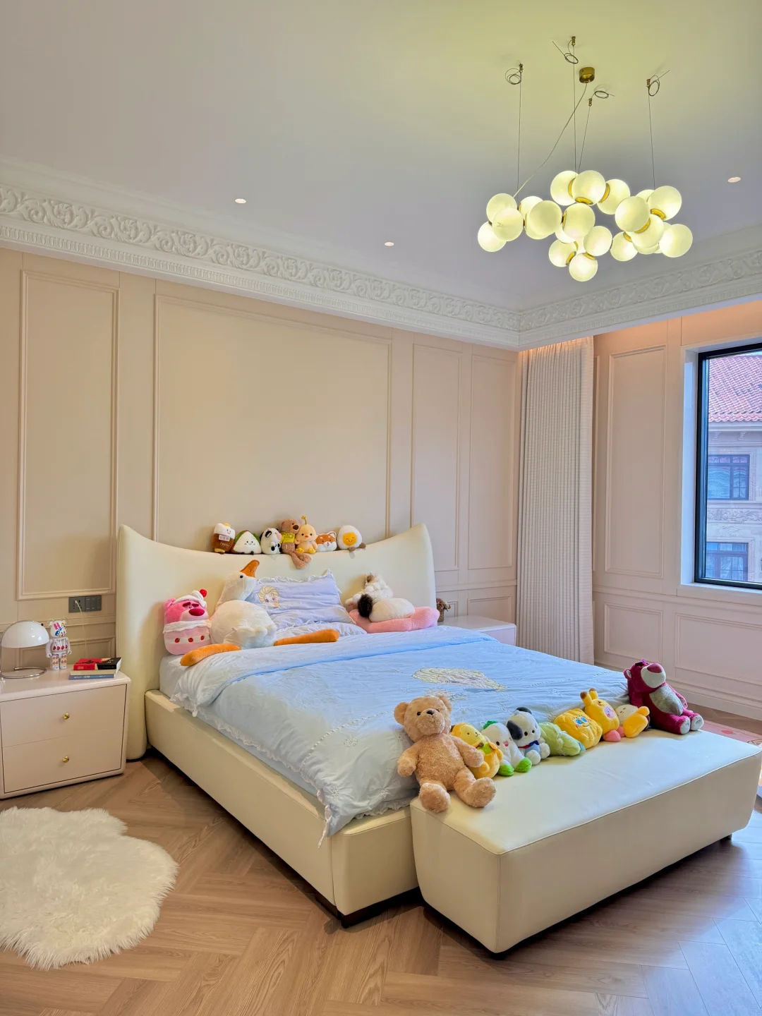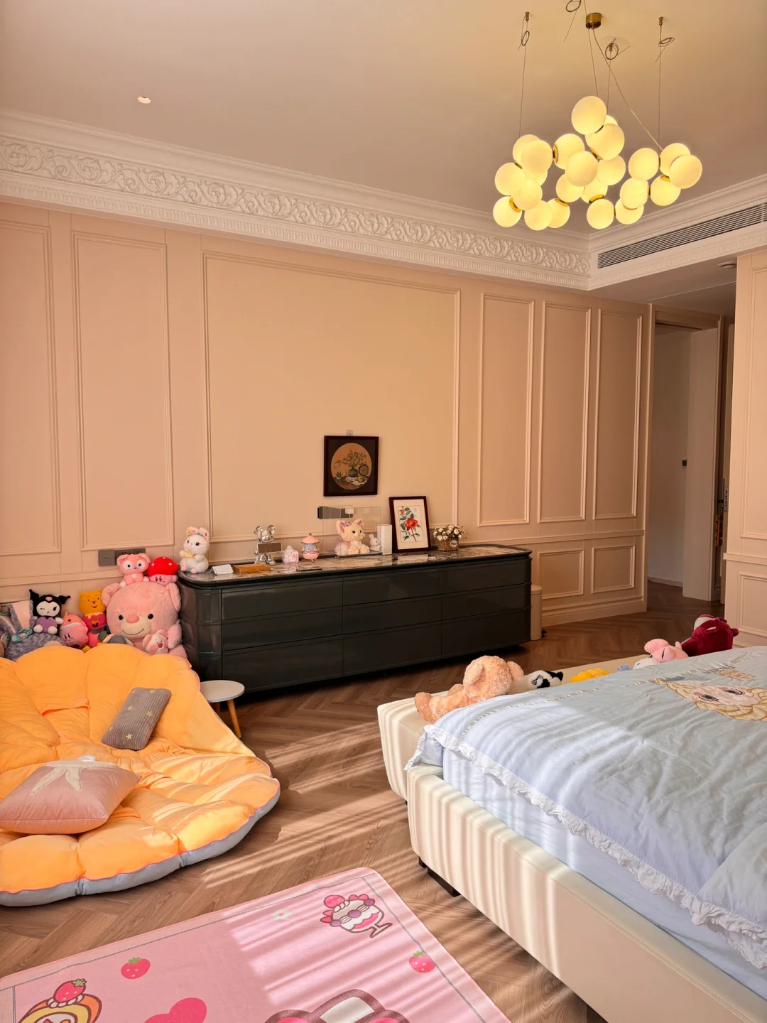 家居美学 女孩房软装 少女心卧室 主卧装修 卧室分享 法式装修 女儿房 每个家都值得用心 欢迎来到我的家 别墅装修 卧室里摆满了她自己抓的娃娃 房间的四件套也是女儿自己挑选的配色 卧室的所有装饰画是女儿小时候自己画的 有些放在她的卧室里 有些我们装订好摆在了其他的房间里 放棉花娃娃的房间呢之前是个衣帽间 女儿有了自己的想法以后 就将它打造成了自己的小天地 希望她能在童年开心快乐
