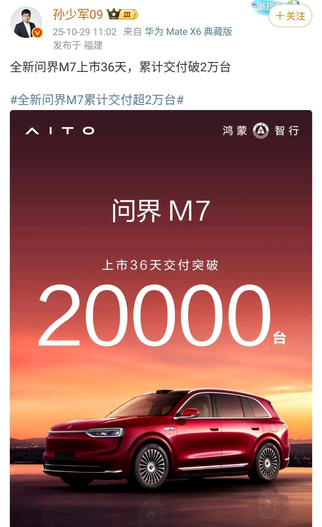 孙少军:全新问界M7上市36天,累计交付破2万台! 这个刷新2万台的速度实在是太快了,只用了一个月多6天的时间就干了2万台,那如果这个月多交付一点,两个月就能干4万辆。 这款车的竞争力确实强,价格下来了车辆的产品力没有下降,相比较问界M8只是车型略微小了一点。 大家是怎么看的?欢迎评论区留言。
