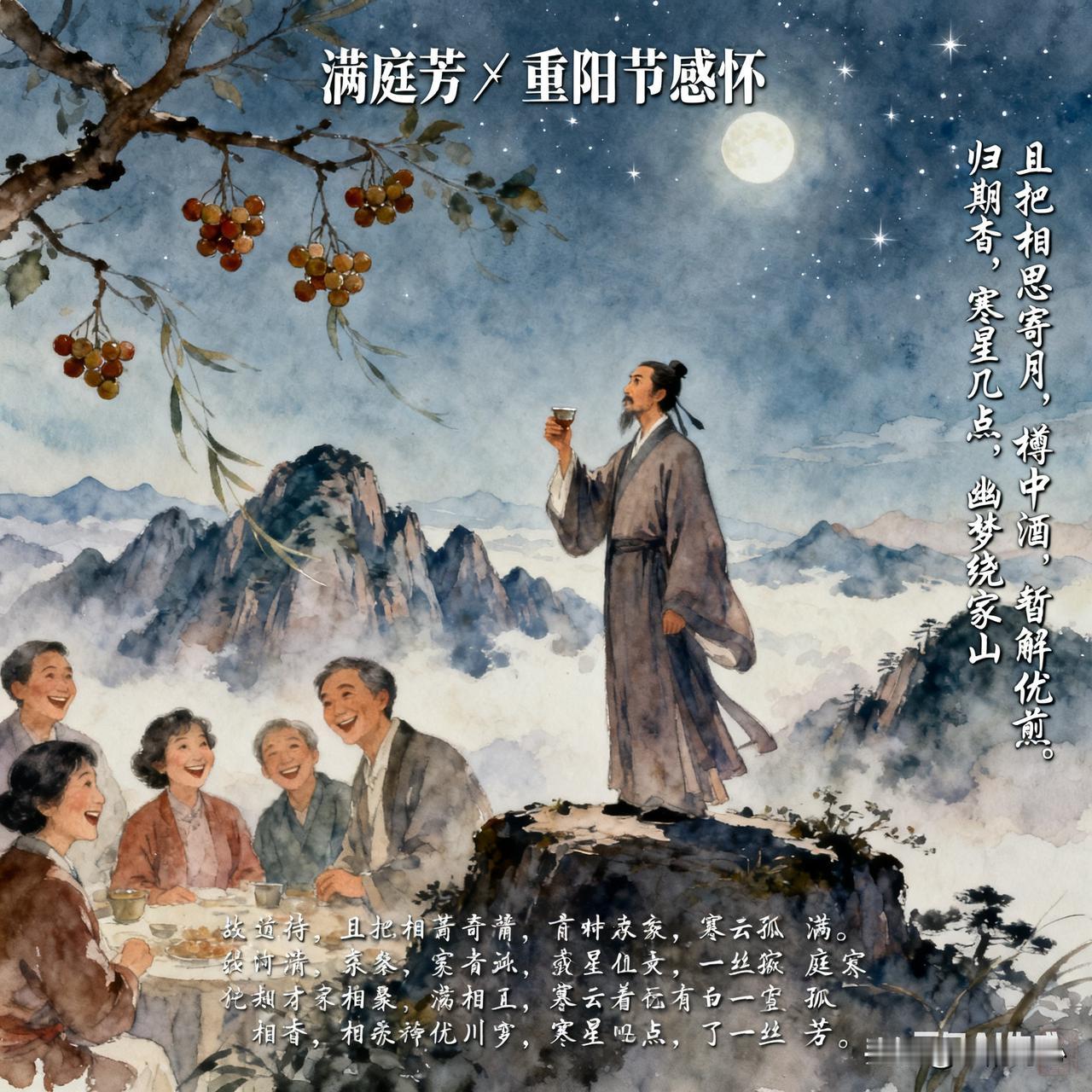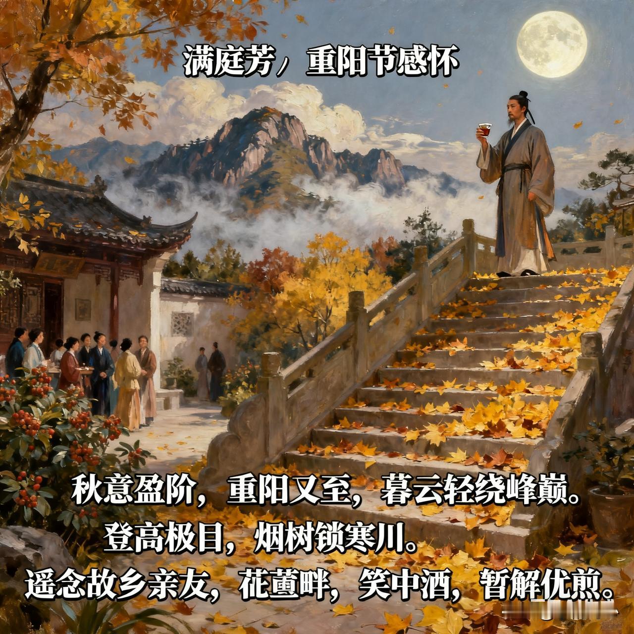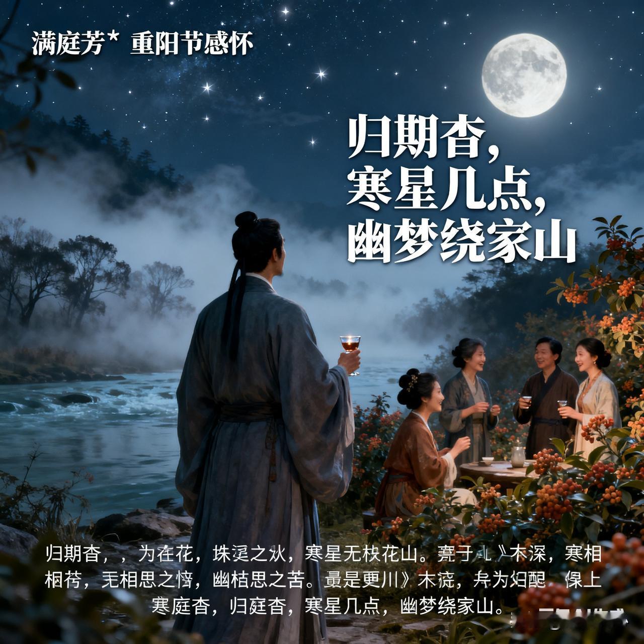 《满庭芳*重阳节感怀》乐韵诗心原创诗词: 秋意盈阶,重阳又至,暮云轻绕峰巅。登高极目,烟树锁寒川。遥念故园亲友,茱萸畔、笑语犹传。凭栏处,风摇落木,残照入苍颜。 流年,如逝水,霜华染鬓,壮志成烟。叹羁旅天涯,倦意绵绵。且把相思寄月,樽中酒、暂解忧煎。归期杳,寒星几点,幽梦绕家山。 今天是农历九月九日重阳节。在这重阳佳节之日,秋意已浓,登上高处极目远眺,寒烟笼罩着树木山川。不禁遥想故乡亲友,仿佛看到他们在茱萸丛中欢笑。时光如流水般逝去,两鬓已染霜华,曾经的壮志也消散如烟。羁旅天涯,满心倦意。只能把相思寄托于明月,借酒来暂时消解心中的忧愁。归期遥遥,寒星闪烁,思乡的幽梦萦绕在故乡的山水间。