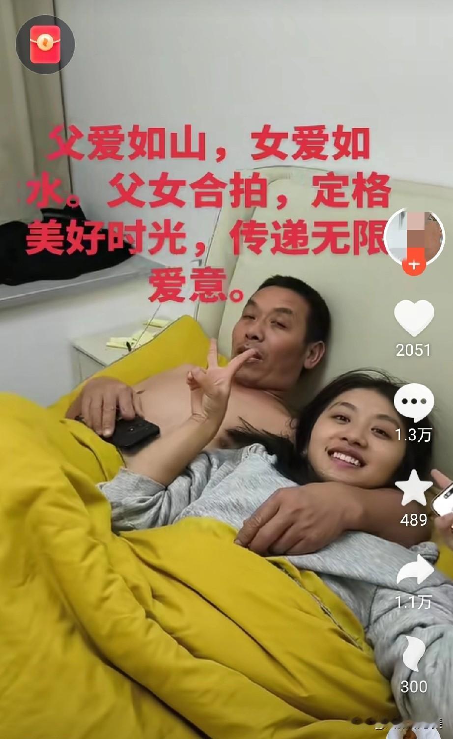 强烈建议封杀此类博主,你看看成何体统,一二十岁的闺女躺在父亲的怀里,其父还光着上身,女儿没个女儿样,父亲没个父亲样,不知道男女有别吗?还有点人伦道德吗?癞蛤蟆爬到脚面上,不咬人它胳应人! 虽然现在改革开放了,倡导个性自由,但也不能没边界乱来,最起码的礼义廉耻还是要有,女儿过了十二岁到了青春期就要点性别意识,和父亲再亲,男女的边界感应该要有的!再和父亲过度亲密就不正常了,老祖宗讲的,女大避父,儿大避母不是没有道理的! 当然也可能有人为了流量而故意这拍的,那就更加可恶了,说伤风败俗一点也不为过! 条友们怎么看?父亲过激行为 、