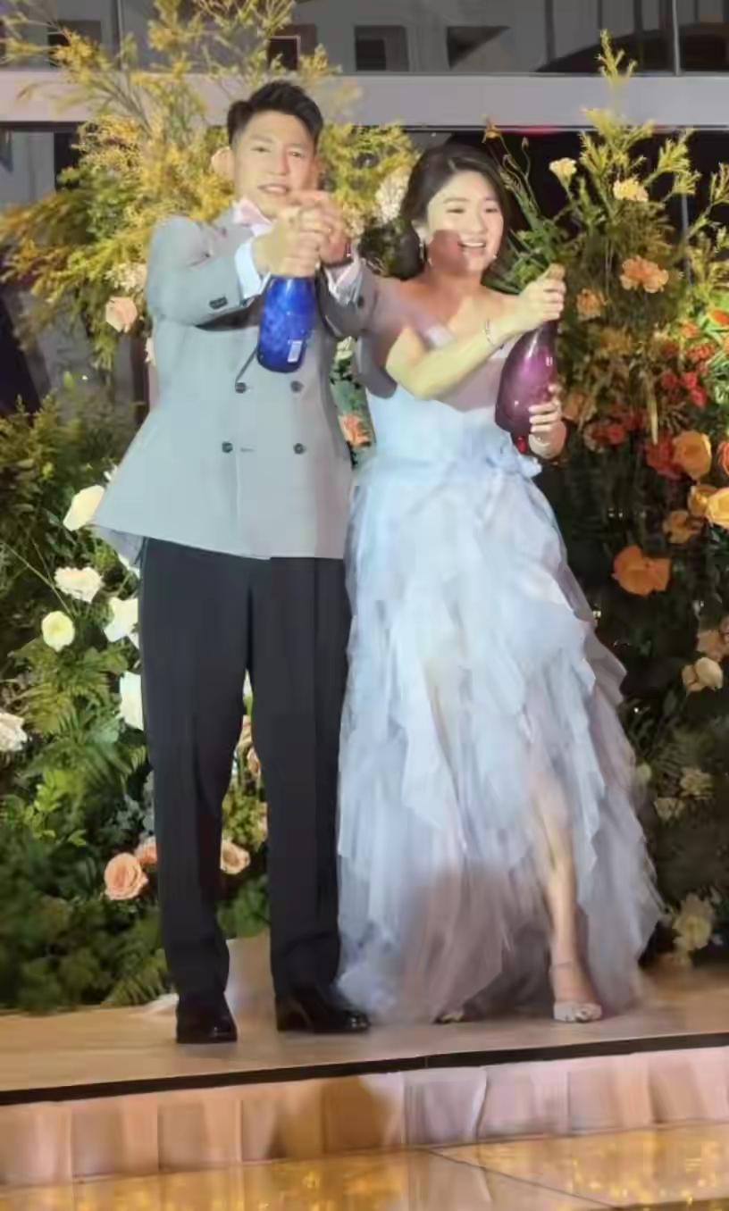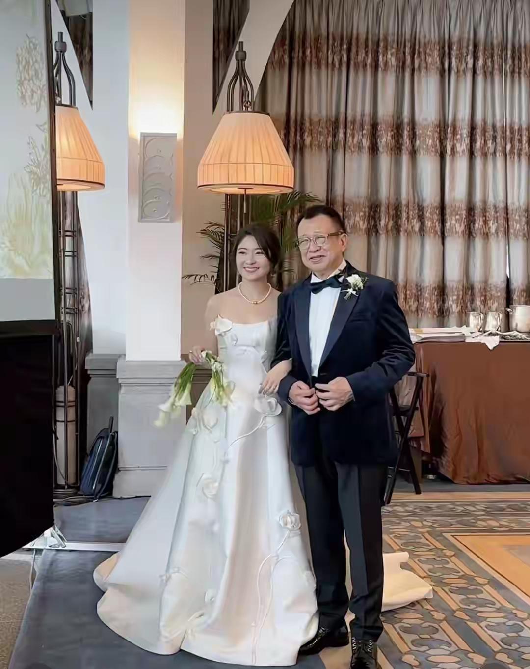 许绍雄女儿图一的婚纱真漂亮,不过地板得干净,要不这么洁白美丽的婚纱一不小心就会弄脏了。这女儿幸福,她是独生女,又嫁得如意郎君。