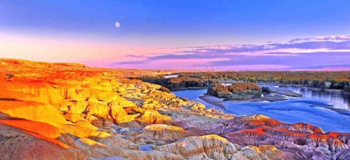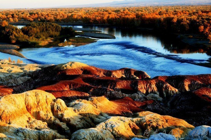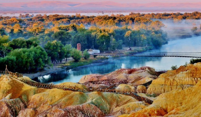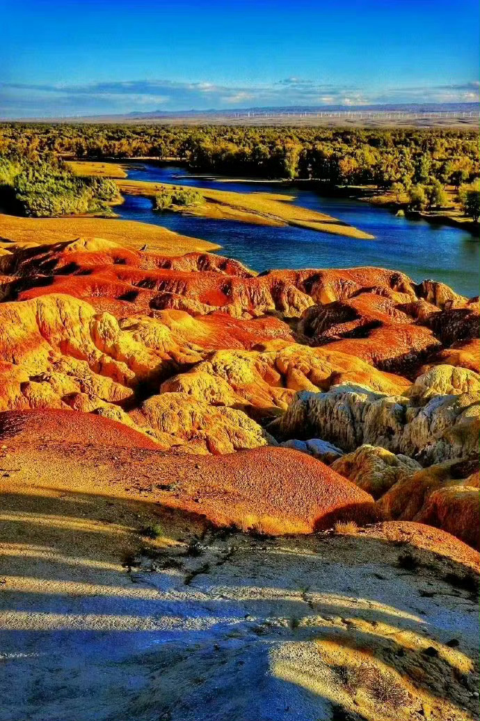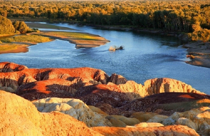一河两岸,南北各异。一边是绿草如茵、山花烂漫、牛羊悠闲,郁郁葱葱的原始丛林,一边是火红干燥的雅丹地貌,戈壁沙漠、奇岩怪石、苍茫荒凉。
