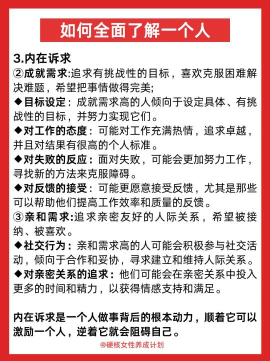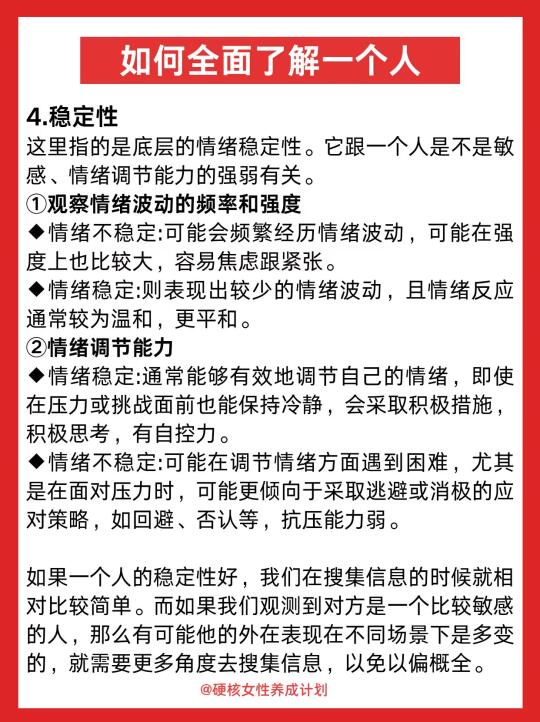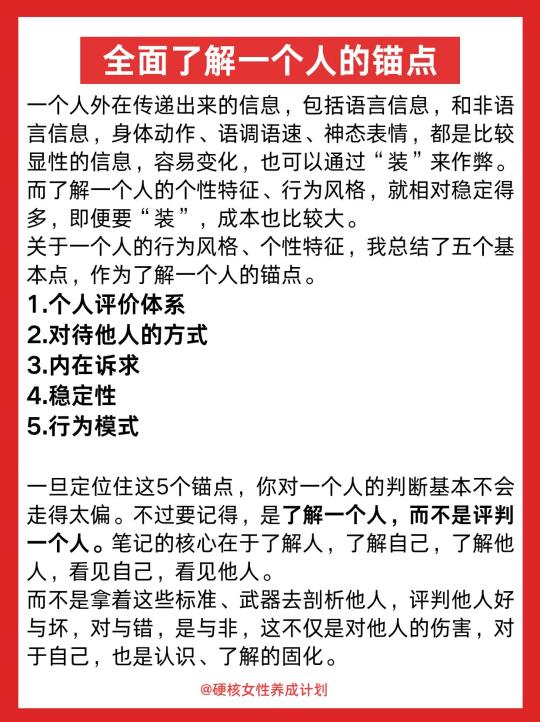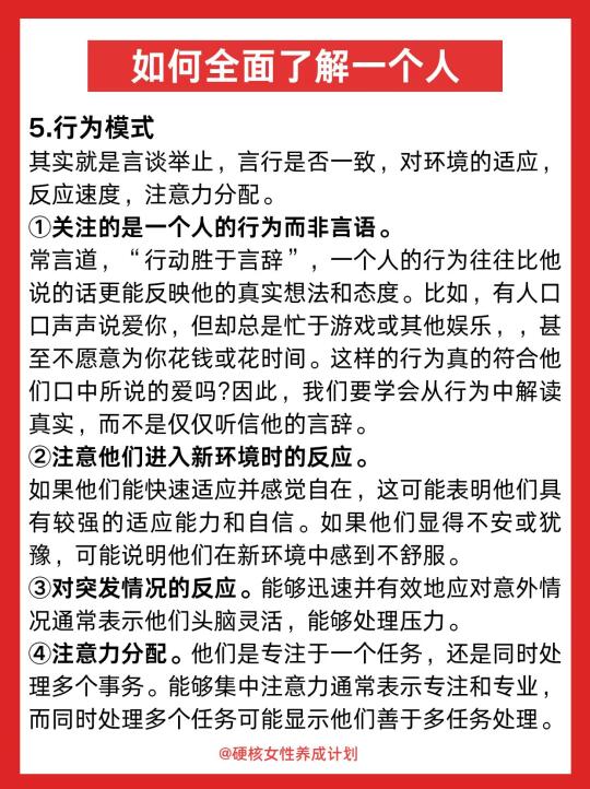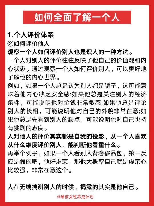 之前出过一期识人术小技巧,今天来教大家如何系统性的认识一个人,抓住五个基本点,由点及面,全面了解,不仅是认清别人的手段,也可以作为认识自己的方式。 没有完美无缺的人。每一种类型的人,都有自己的优点,也有自己的缺点。 对于烂人,要避而远之。但强势的人,懦弱的人,也不必特意疏远。不同性格的人,能用不同的方式对待,这才是我们了解各种类型的人的目的。 希望大家都能快速远离烂人,不断成为更好的人!