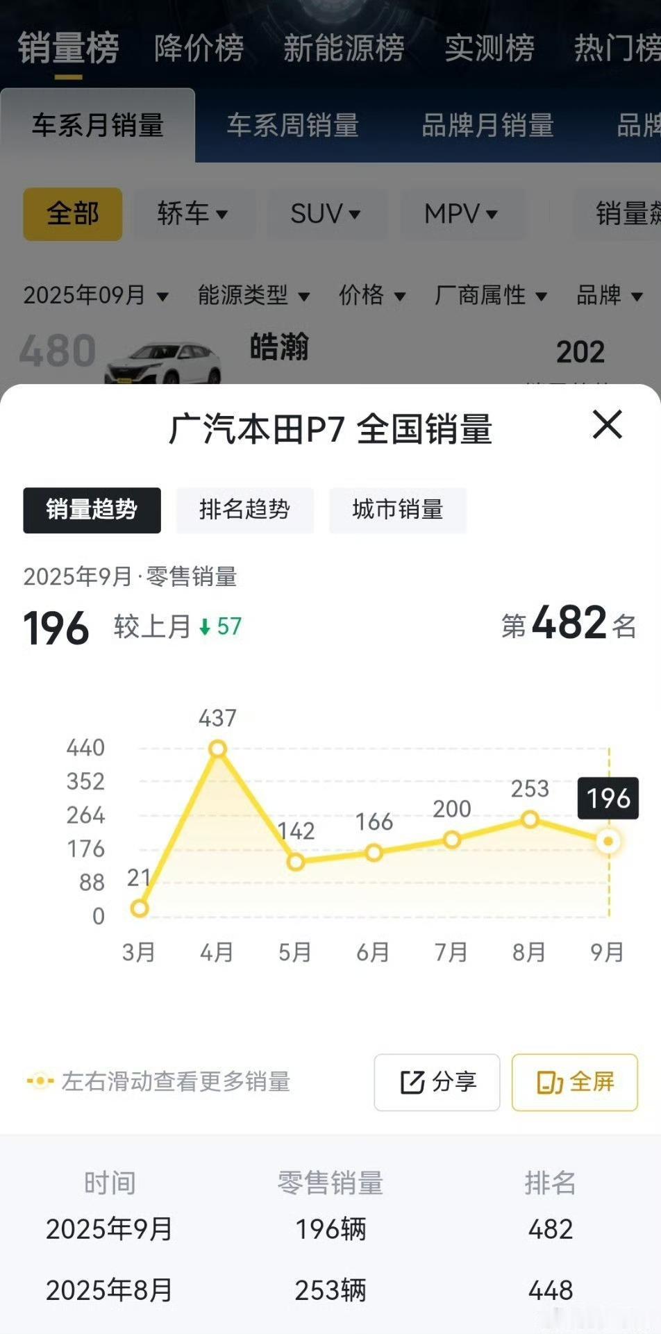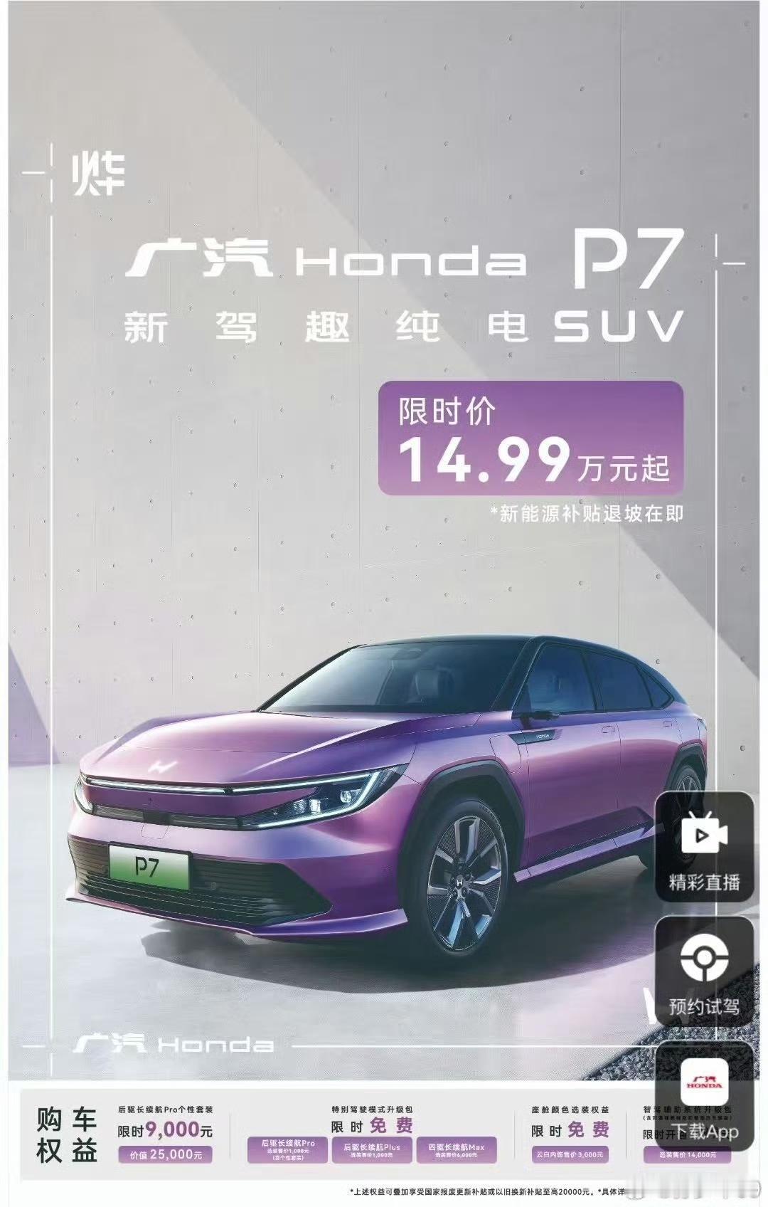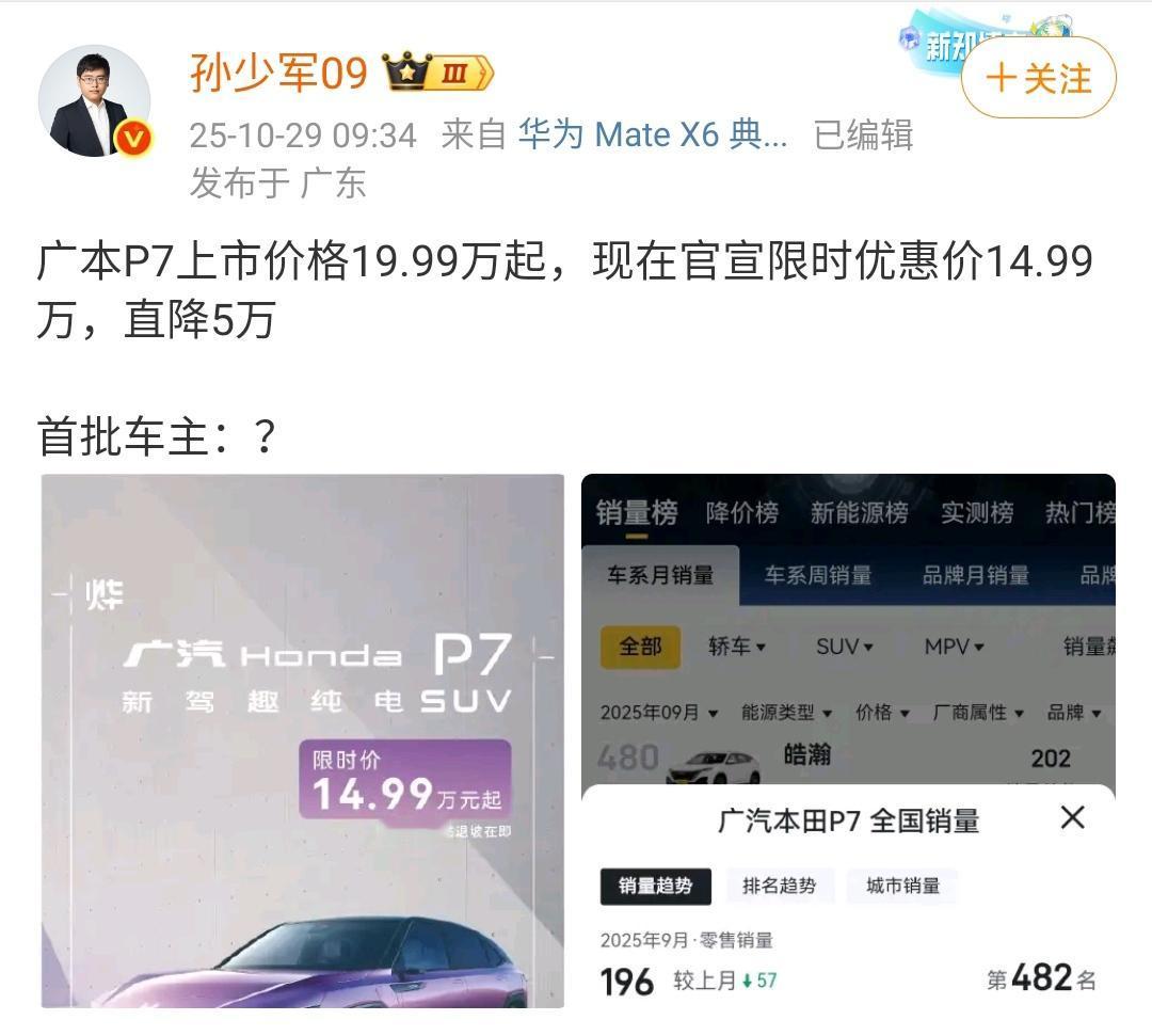 广汽本田P7上市价格19.99万起,现在官宣限时优惠价14.99万,直降5万!这样就显得首批车主很呆? 这款车型是有竞争力的,但是定价上失败的定价太贵了,导致这款车的月销量只有几百台,几百台的销量肯定是撑不起一辆车型的正常发展的,少说也有几千台才可以。 大家觉得降价之后其销量能否大幅度的增长,欢迎评论区留言。