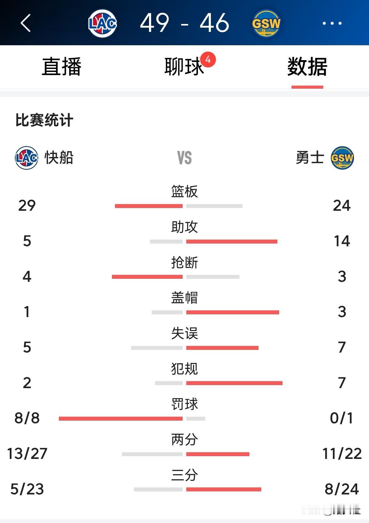 单打独斗!快船上半场只有5次助攻 今天快船在客场挑战勇士,半场结束,快船以49-46领先。 上半场,快船陷入单打独斗局面。全队只有5次助攻。可喜的是第二节快船加强了防守,让勇士仅得到13分。在首节落后8分的不利局面下将比分反超。