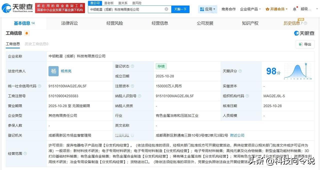【中铝集团、云南铜业等在成都成立科技公司 注册资本15亿】 天眼查App显示,近日,中铝乾星(成都)科技有限责任公司成立,法定代表人为杨秀亮,注册资本15亿人民币,经营范围包括新材料技术研发、电子专用材料研发、电子专用材料制造等。股东信息显示,该公司由中国铝业集团有限公司、驰宏锌锗(600497)、云南铜业(000878)等共同持股。 天眼查信息: