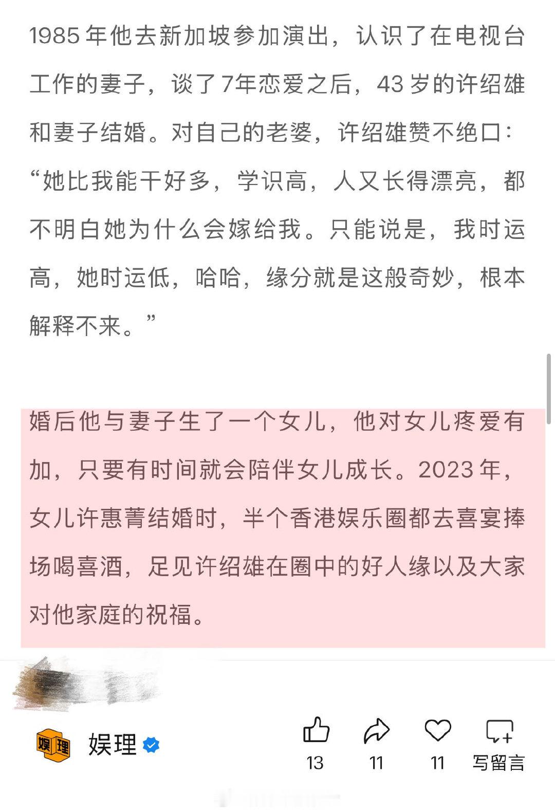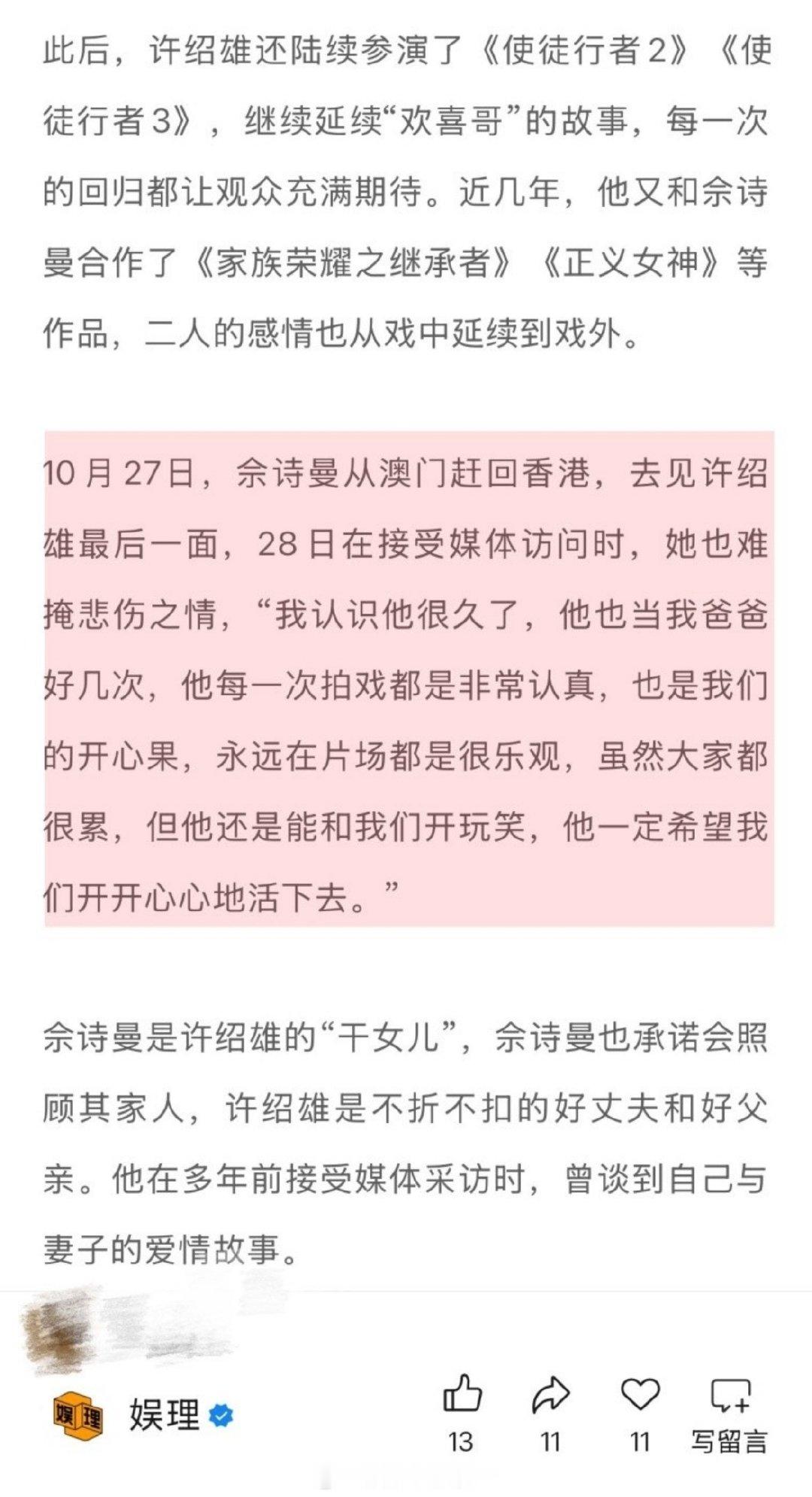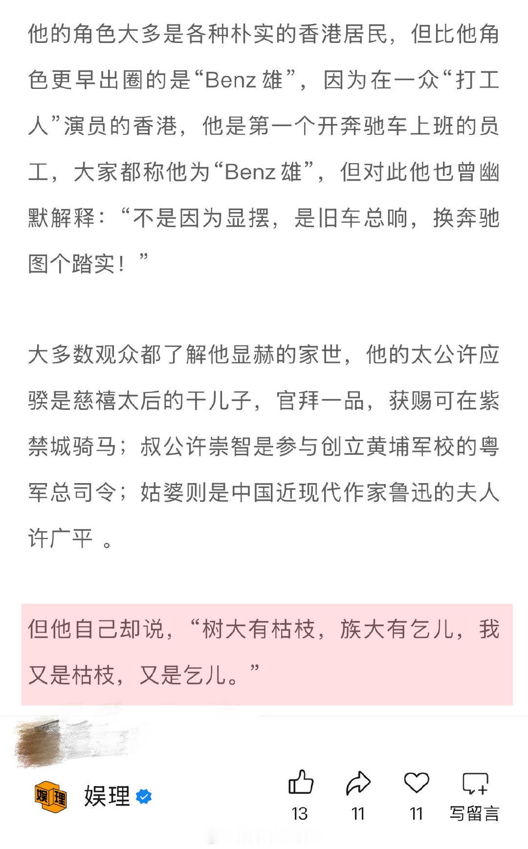 许绍雄 演到生命的最后一刻 许绍雄说最好的告别是活在角色里 许绍雄的角色大多是各种朴实的香港居民,但很多观众都了解他显赫的家世:他的太公许应骙是慈禧太后的干儿子,曾官拜一品,获赐可在紫禁城骑马;叔公许崇智是参与创立黄埔军校的粤军总司令;姑婆则是中国近现代作家鲁迅的夫人许广平 。但许绍雄自己却说,“树大有枯枝,族大有乞儿,我又是枯枝,又是乞儿。”娱理独家↓