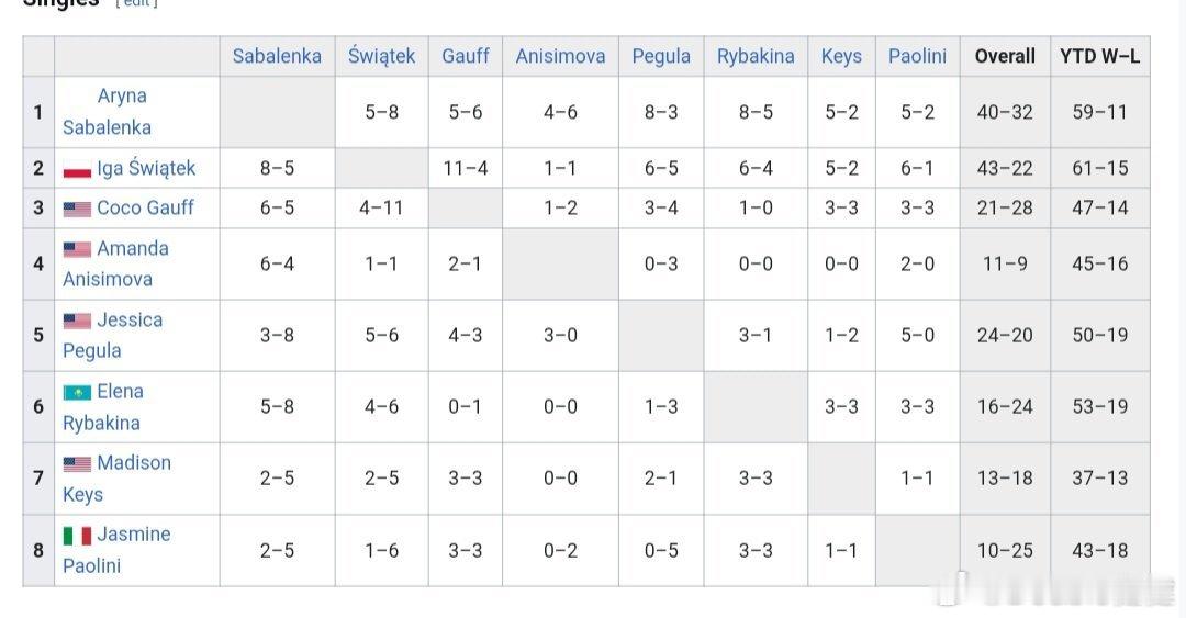 斯瓦泰克43胜22负最占优,泡里尼10胜25负垫底。阿尼西莫娃和莱巴金娜和凯斯都还没交手过。高芙和莱巴金娜就打过一次。