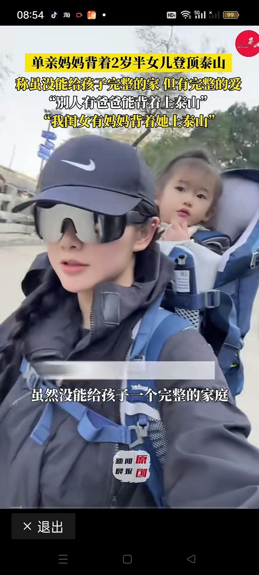 单亲妈妈背着两岁半女儿凳顶泰山,单亲妈妈声称:虽没给孩子完整的家,但能给她完整的爱,伟大的妈妈代替了爸爸的爱。 单亲妈妈再怎么爱,也比不过来自家庭中的父爱,孩子最渴望的是父母双方的爱,一个两岁半的孩子过早的没了父爱,将是她这一生的缺失!一位单亲妈妈不容易还是趁早再组建个家庭吧!