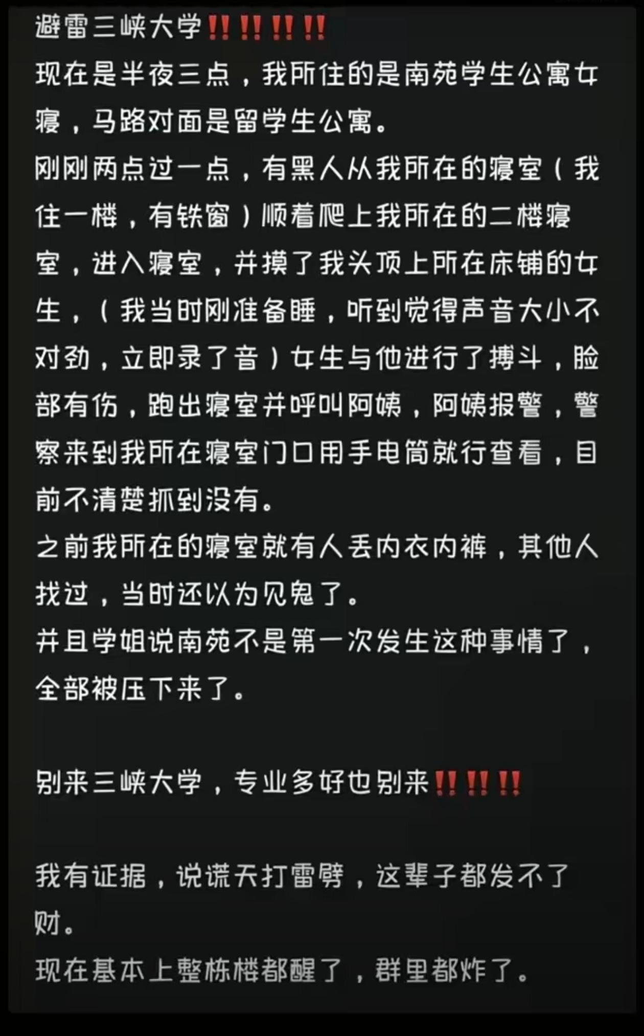 应该是谣言,哪里会有这么猖狂的人类? 网传三峡大学黑人留学生攀爬女生宿舍楼猥亵女学生,一名黑人留学生徒手攀爬至女生宿舍二楼,企图猥亵一名女学生,受害女生奋力反抗并大声呼救,迫使黑人留学生仓皇逃离! 相关部门应该尽快查清并辟谣。