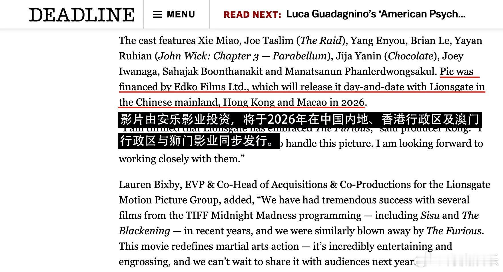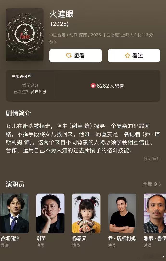 狮门官宣获谢苗新片海外发行权 谷垣健治执导、谢苗主演的动作电影《火遮眼》将由狮门影业海外发行。此前狮门影业出品发行过的影片很多具备“宝藏”潜质,如《电锯惊魂》《暮光之城》《饥饿游戏》《惊天魔盗团》《疾速追杀》无论是艺术品质还是商业成绩,均获得不俗表现。