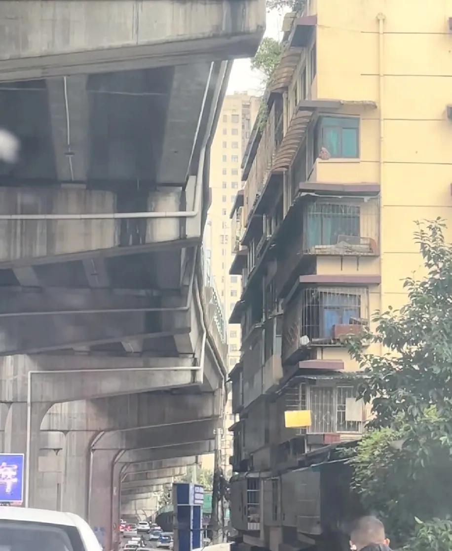 第一次见离高架这么近的楼,台跟高架桥墩就隔1米,车开过去跟贴耳朵边按喇叭似的。 光看这距离我都替住户头疼,白天是车流的“嗡嗡”声循环播放,晚上大货车的轰隆声不得直接钻被窝?怕不是得戴着降噪耳机睡觉,连说句话都得扯着嗓子喊。 以前总说“高架房便宜”,但这便宜也太遭罪了吧?住这儿不光吵,灰尘估计也能堆一窗台。
