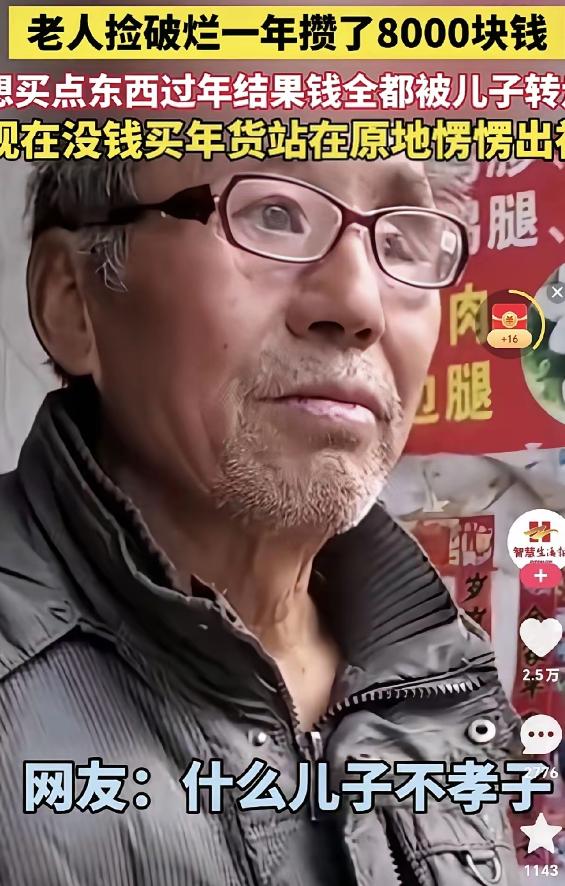 寒心呀! 老人捡破烂,一年攒了8000块钱,本想着过年买些年货,谁知道,儿子把钱悄悄地全转走了,现在没钱买年货了,老人站在那儿愣愣的出神!一副绝望无助的表情,看着着实令人心疼! 此刻,想必伤心大于气愤!那种刺骨的痛是从心底里冒出来,寒气逼人! 这才是农村老人生活困难的根本原因 上次也看到一个视频,一个农民大爷77了,还在工地上掰钢筋,主播问他为什么这么大年龄还干,大爷说前几年攒的钱给儿子买了车,孙子也想要 如果农民每月有一千元的退休,他们的晚年生活也能过的去,可是这…… 对此你怎么看?