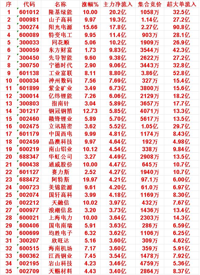 10月29日尾盘30分钟,主力资金“大幅抢筹的”35名单一览! 隆基绿能:主力净流入 20.2亿元,集合竞价成交 1058万元 山子高科:主力净流入 19.3亿元,集合竞价成交 1.14亿元 阳光电源:主力净流入 17.8亿元,集合竞价成交 2.27亿元 特变电工:主力净流入 11.4亿元,集合竞价成交 903万元 同花顺:主力净流入 10.2亿元,集合竞价成交 1909万元 东方财富:主力净流入 9.83亿元,集合竞价成交 3544万元