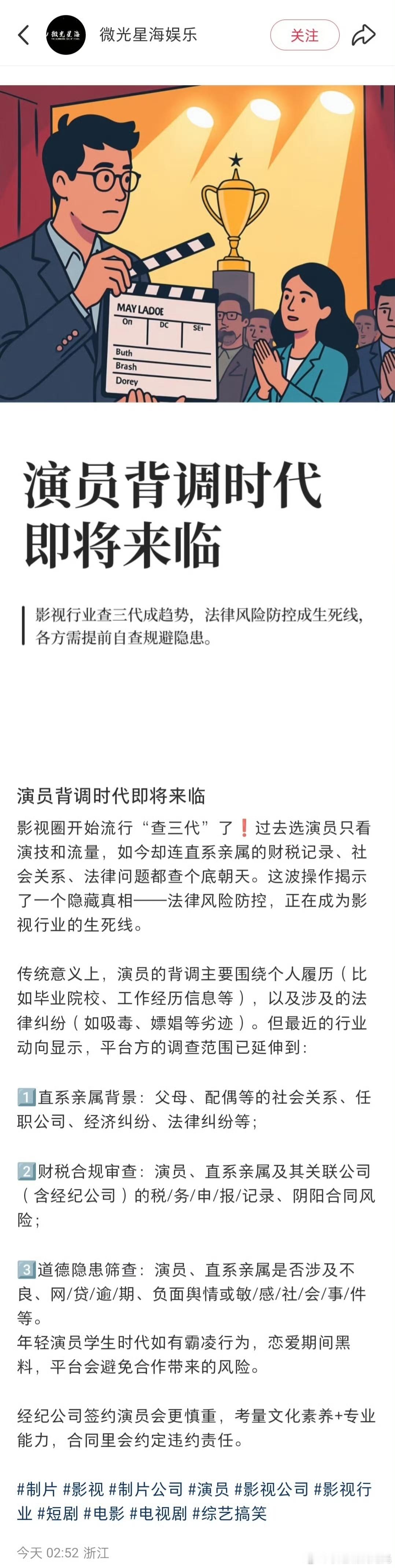 有网友发文爆料,为了防范风险,现在影视行业已经开始流行查三代了。不但查演员,连直系亲属的都要查,尽可能避雷。