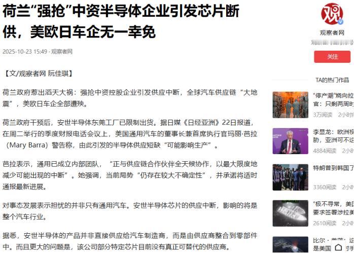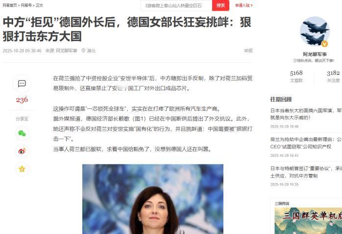 中方“拒见”德国外长后,德国女部长狂妄挑衅:狠狠打击中国! 荷兰那边刚用1952年从没启用过的旧法律,强行把中资控股的安世半导体揽入怀中,不仅冻结资产、罢免中方CEO,还安排外籍董事掌权,嘴上喊着“防止技术被掏空”,连份像样的证据都拿不出来。 中方反制的拳头刚落下去,荷兰经济大臣卡雷曼斯就先慌了神,没过几天就公开承认“低估中方韧性”,转头就求着要谈豁免事宜。 可德国经济部长赖歇偏要跳出来唱反调,一边帮荷兰的强取豪夺站台,表示不会抗议荷兰对安世半导体的国有化,一边放话要“狠狠打击中国”,这股硬气背后藏着的其实全是心虚。 安世半导体早不是普通企业,全球汽车功率芯片市场里,它的产品藏在每辆汽车的电控单元里,德国车企每辆车搭载的这类芯片最多能到五百枚。 更关键的是,这家公司70%的产能都扎在中国苏州、东莞的工厂里,晶圆制造、封装测试这些核心环节全在中国掌控中,荷兰抢来的不过是尼姆韦根总部的空壳子,连合格品率都维持不住。 中方直接叫停安世中国工厂的海外供货,相当于攥住了欧洲工业的“命门”,德国汽车工业协会10月初就收到了安世的断供预警,负责人西蒙·舒茨急着警告,再解决不了就得停产。 德国工业对中国芯片的依赖早不是秘密,《商报》的报告扒得明明白白,欧洲航空航天企业全在用中国产的安世芯片,机械制造业里这一比例高达95%,医疗技术领域也有86%。 大众集团内部人士偷偷跟德媒爆料,眼下的芯片库存撑不过一周,部分车型生产线已经出现10%的空转率,百万辆汽车的生产计划要泡汤。 要知道大众本就腹背受敌,中美两大市场销量接连下滑,这会儿再遇停产危机,财务报表上的窟窿只会越来越大。 宝马嘴上说生产没受影响,却私下里让供应商每天汇报库存,奔驰更是悄悄绕开荷兰管理层,直接给安世中国区递订单,用实际行动打了赖歇的脸。 欧洲汽车制造商协会早算出了账,全行业的安世芯片库存普遍只剩几周,就算找替代供应商,光认证流程就得耗上数月。 德国电气工程师协会更直接,预警几周内就会出现全面短缺,而这种芯片不只装在汽车里,连咖啡机、洗衣机都得用,等于整个欧洲的日常生产生活都要被波及。 赖歇不可能不知道这些底细,她所在的经济部10月下旬还急着组织车企开电话会议,想找“快速解决方案”,可转头就放出强硬言论,说白了就是想靠狠话逼中方让步,顺便给国内焦虑的企业吃颗“虚定心丸”。 更讽刺的是,德国自己的芯片企业英飞凌,29%的收入都来自中国市场,比日美德三国总和还多,中国车企对德国芯片的信任度一直不低。 可赖歇只字不提这种相互依赖,反而跟着荷兰的节奏起哄,完全忘了德国经济刚被美国关税折腾得够呛,对外贸易贡献连续两年预计为负,能源和人工成本还在飙升。 现在又主动把半导体供应链往火坑里推,难怪有欧洲网友嘲讽,这是把“北溪管道之后的又一生命线”亲手交到别人手里。 中方的反制里藏着十足的底气,安世中国区直接声明荷兰总部的决定在中国没用,业务照样运转,母公司闻泰科技一边走法律程序维权,一边拉通国内供应链“自救”。 更要命的是,国产替代已经接上来了,士兰微挤进了特斯拉供应链,芯联集成在碳化硅模块市场占了8.4%的份额,华润微的高端器件也通过了车厂验证,2025年国产手机功率器件自给率都从18%涨到35%了。 赖歇喊着要“打击中国”,可德国车企连绕开荷兰管理层找中国工厂拿货都干出来了,真要彻底撕破脸,先扛不住的只会是欧洲的生产线。 欧盟的行动早就暴露了真实态度,荷兰刚抢完企业,欧盟代表团就连夜赶来谈稀土和芯片出口,生怕晚一步工厂全关门。 德国自己也悄悄把取消的访华行程改成“推迟”,嘴上说着要对话,赖歇却偏要放狠话,这种分裂的操作,说到底还是想在博弈里占点口头便宜。 毕竟安世断供的疼在自己身上,中方反制的力度又超出预期,只能靠强硬言论遮掩产业链被卡脖子的窘迫,可数据和车企的动作摆在那,再硬的话也掩不住底气不足的真相。