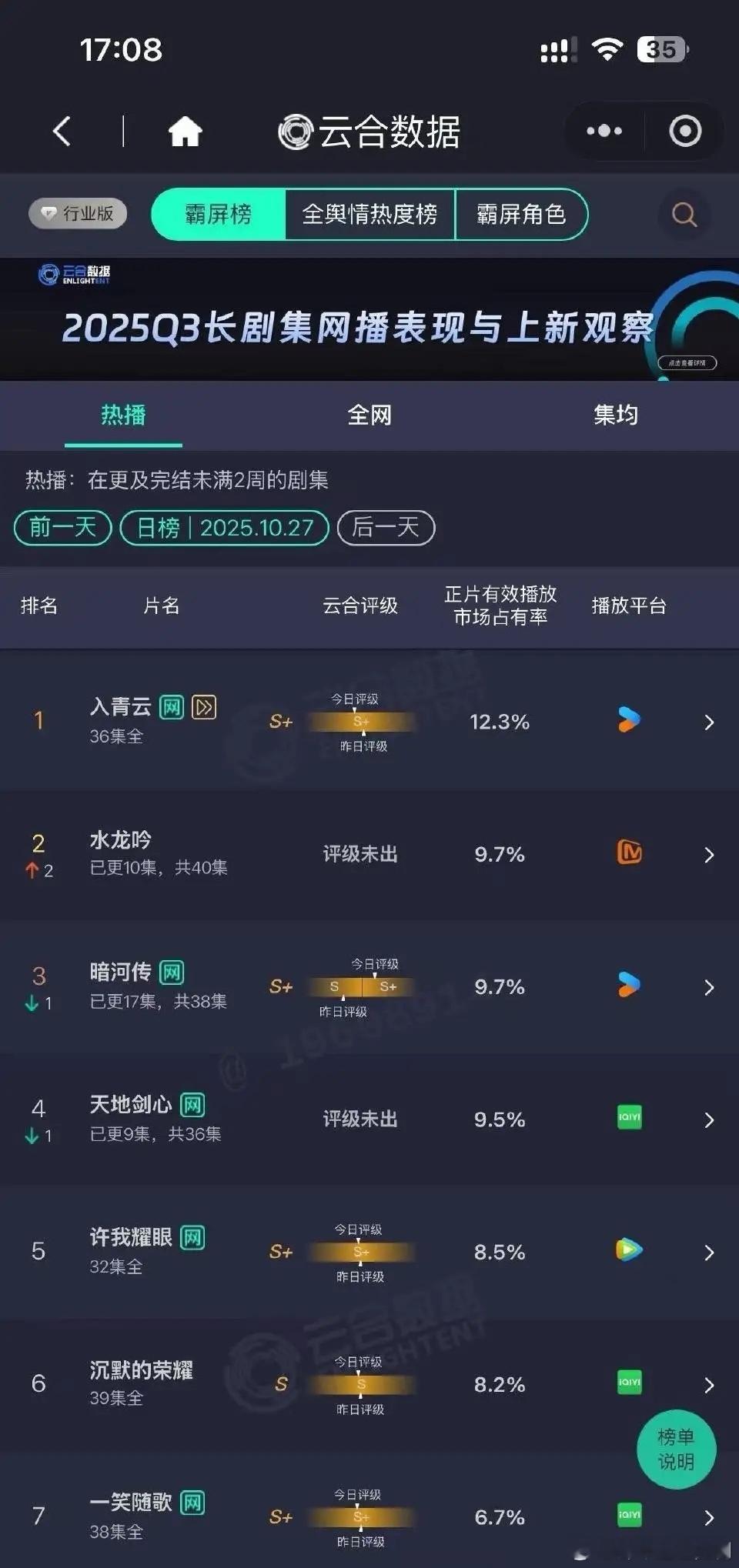暗河传真的是妥妥的黑马啊!真的是太强了啊!云合评级直接直接冲上s了啊!什么实力不用多说了啊