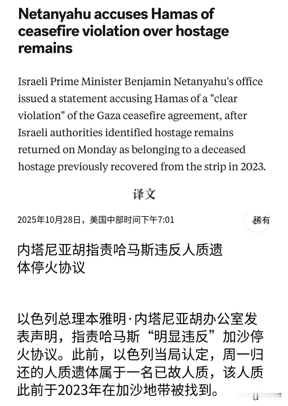 【以色列指责哈马斯武装未按协议要求交还人质遗体】 综合媒体消息,以色列总理办公