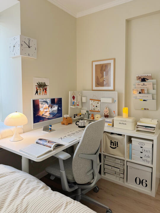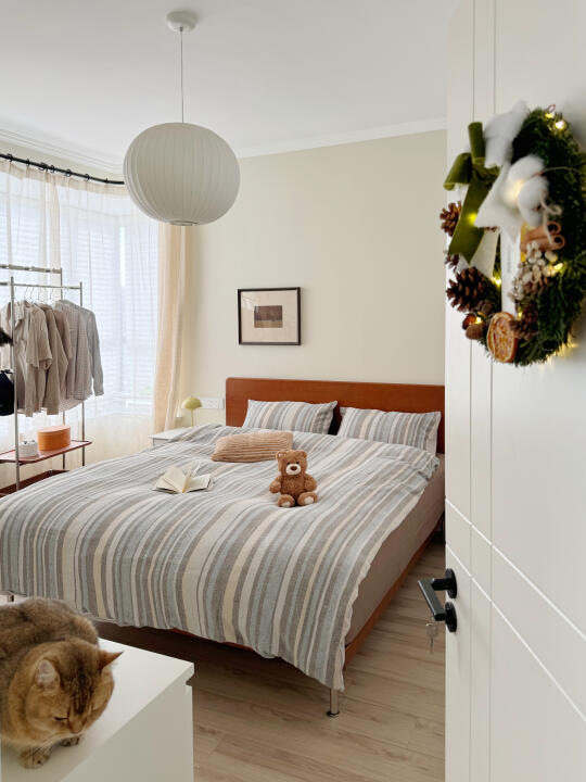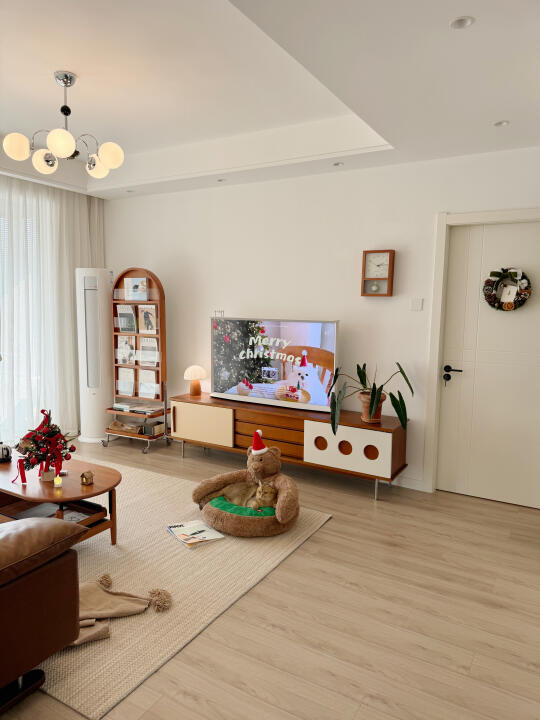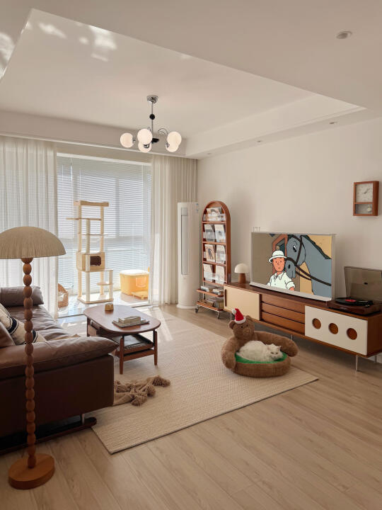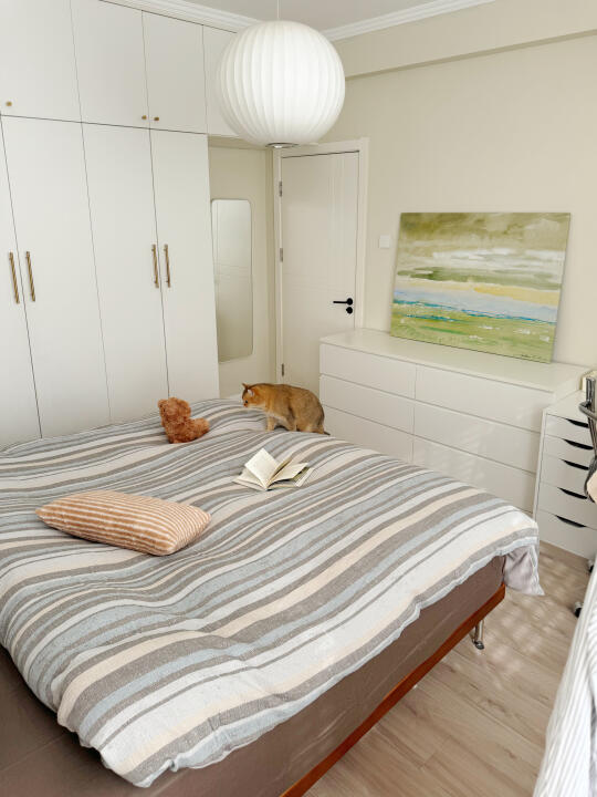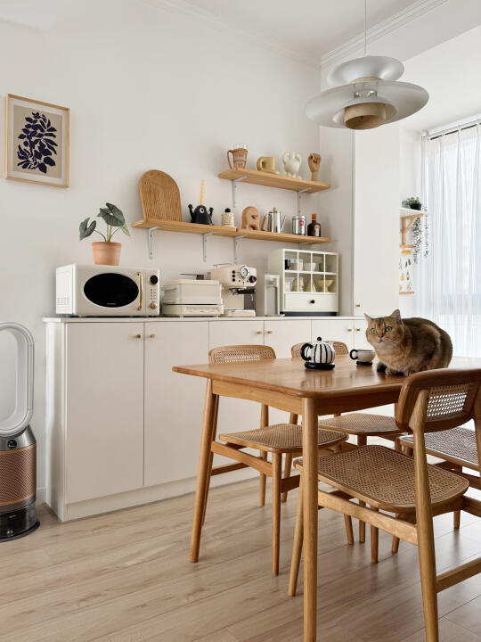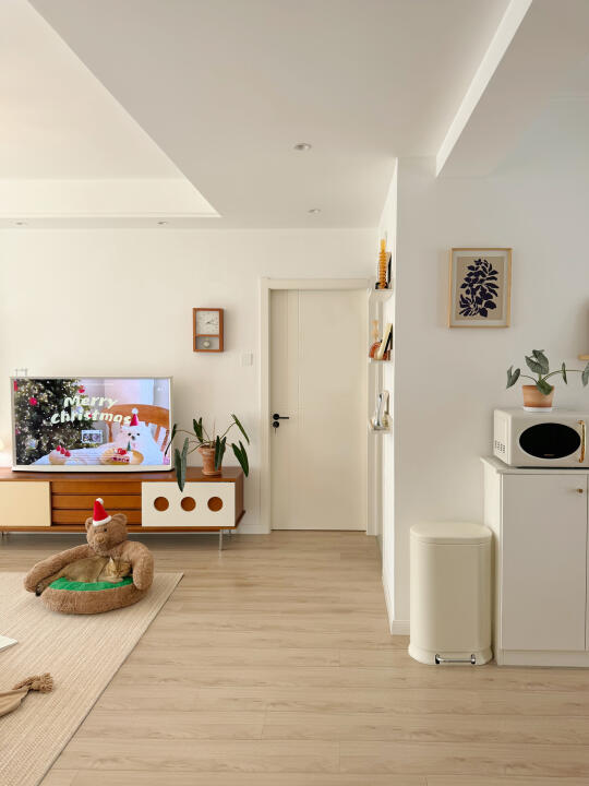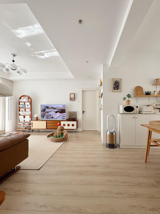 普通人没请设计师,靠翻装出的家~自己倒腾,害怕翻车硬装从简,装成这样已经拼尽全力……小户型简单硬装不仅显大,而且省钱又耐看。 客餐厅没做复杂背景墙,刷白色乳胶漆,地面通铺地板,卧室门选的白色烤漆门,简约百搭~ 客厅双眼皮吊顶,四周射灯,中间装ins魔豆吊灯,灯光让家温馨有氛围感~ 软装没有固定的风格,只是把自己喜欢的家具搬回家,色调尽量统一就好~硬装简简单单其实可以通过软装布置出好看的家~ -