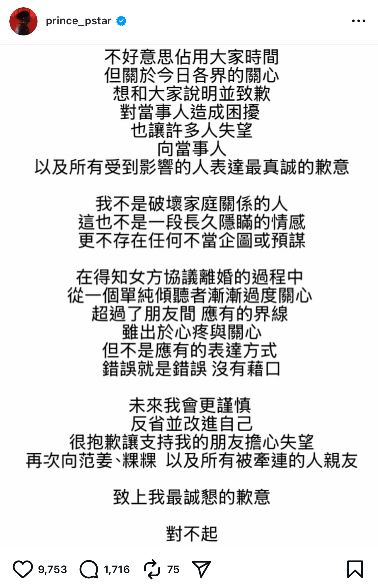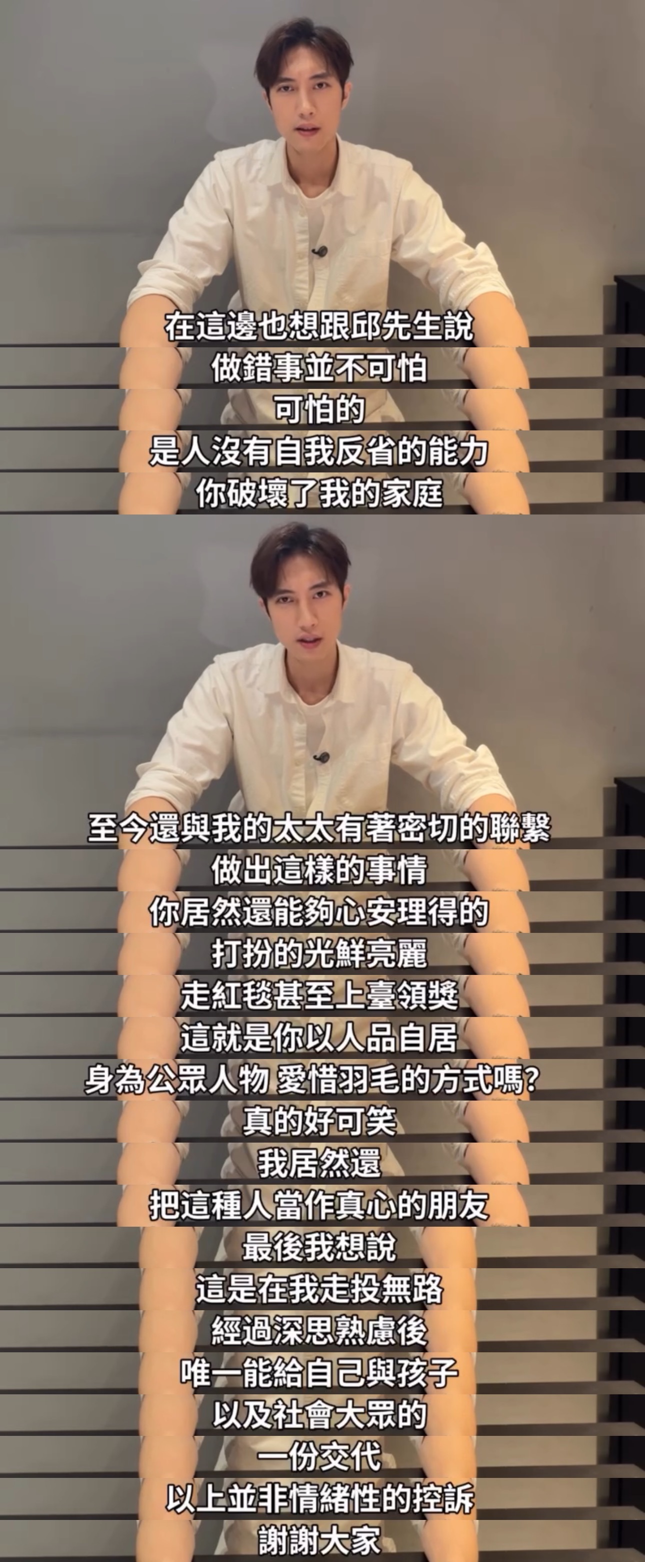 王子邱胜翊发文道歉了,说自己不是破坏家庭关系的人,也没有不当的企图和预谋。
