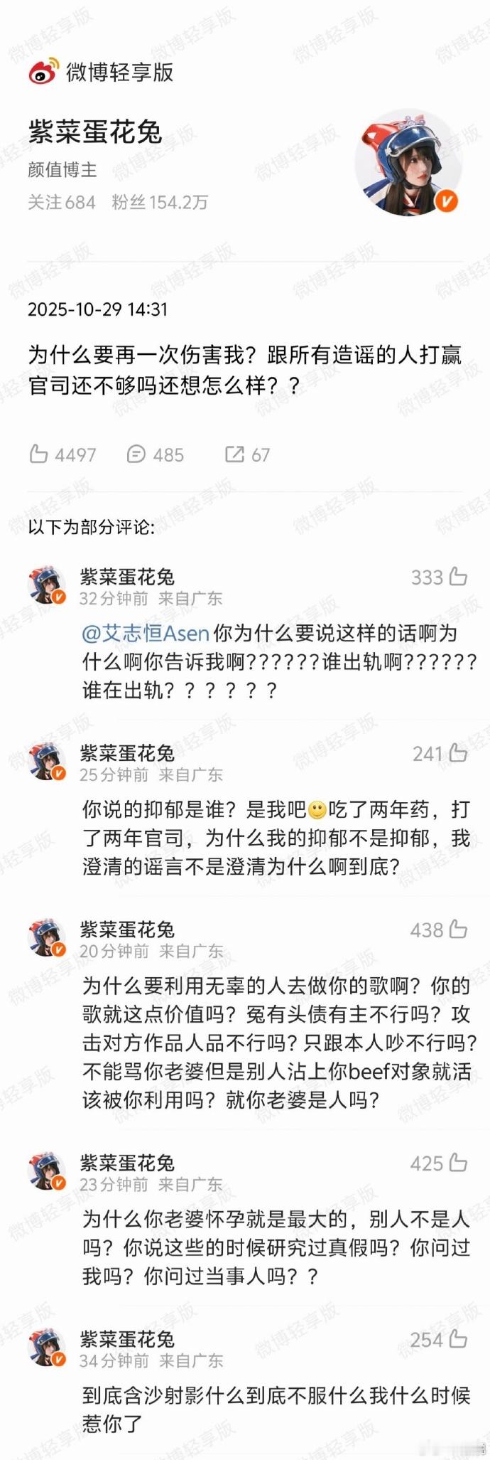 法老前女友喊话asen法老前女友问asen到底谁出轨 法老前女友“紫菜蛋花兔”喊话Asen:“为什么要再一次伤害我?跟所有造谣的人打赢官司还不够吗还想怎么样?? ”“你为什么要说这样的话啊为什么啊你告诉我啊??????谁出轨啊??????谁在出轨??????”