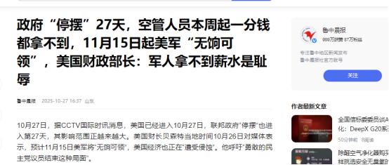 130万美军断薪了! 当地时间10月27号,美联邦政府停摆满27天,麻烦还在扩大。财长贝森特26号放话,11月15号起130万美军要“无薪可领”,要知道这可是二战后美军首次面临大规模欠薪,连越南战争、冷战最紧张时都没出过这事儿,他还喊民主党议员“别折腾了”,可这话没多少人听。 贝森特不是在危言耸听,他在之前的采访里透露,10月中旬政府就动用了五角大楼的剩余资金,才勉强发了当月军饷。 他坦言11月初还能撑最后一次,但到15号就真的没钱了。“这太令人难堪了”,贝森特的这句话,道出了当下美国政府的窘境。 这场停摆已经持续近一个月,联邦政府从10月1号就正式“关门”,起因是两党在新财年预算上谈崩了。 共和党控制的众议院和民主党主导的参议院,把医保政策当成了博弈的焦点。民主党要求延长《平价医疗法案》的税收抵免政策,这关系到两千多万人的医保支出。共和党却觉得这是“无关紧要的问题”,不肯在临时拨款法案里加入相关条款。 双方就这么耗着,参议院已经对拨款法案发起13次投票,每次都因票数不够被否决。众议院议长约翰逊把责任全推给民主党,民主党领袖舒默则直言不接受共和党“打补丁”式的方案。副总统万斯早在停摆前就撂了话,“我认为我们正走向停摆”,如今这话成了现实。 而美军成了这场政治博弈的直接受害者,130万现役军人里,不少人已经开始犯愁。有士兵在社交平台透露,家里房贷还款日越来越近,孩子的奶粉钱也快见底,之前还能靠存款周转,再等半个月真不知道怎么撑。这些人要维持日常训练,有的还在海外部署,却得面对“干活没报酬”的尴尬。 况且受影响的不只是军队,联邦政府里,200多万雇员被卷入停薪风波。75万人被迫休假,他们只能四处找兼职,或是向银行申请延迟还贷。没休假的那些人更惨,明明每天上班,工资却一分钱没着落。华盛顿、纽约等地的联邦雇员已经举着标语上街抗议,他们的口号里全是无奈。 社会各个角落都在感受停摆的阵痛,机场成了重灾区。波士顿、芝加哥等多地的航空管制员出现短缺,航班延误已经成了常态。眼看11月27号感恩节就要到,出行高峰叠加人员不足,航空系统混乱可能会更严重。有业内人士早就警告,政府停摆正在降低航空系统的安全性。 民生保障线也快撑不住了,费城的食品银行失去850万美元联邦资助,负责人说援助工作越来越难。覆盖700万低收入人群的营养补充计划,资金可能月底就耗尽。农业部更是直接预告,11月起4200万人的食品券发放将暂停。 经济层面的损失正在不断扩大,经济学家测算,停摆满一个月就会额外导致43000人失业,消费者支出将减少300亿美元。美联储主席鲍威尔最近讲话总绕不开劳动力市场,因为政府停摆让相关数据收集中断,官员们对经济现状的判断都成了“盲猜”。 现在距离11月15号越来越近。美军的欠薪倒计时已经开始,两党却还没拿出解决办法。这场由政治斗争引发的停摆,正在把更多美国人拖进困境。没人知道这场僵局还要持续多久,但所有人都清楚,再耗下去,受伤害的只会是普通民众。 来源:鲁中晨报 【政府“停摆”27天,空管人员本周起一分钱都拿不到,11月15日起美军“无饷可锣”,美国财政部长:军人拿不到薪水是耻】