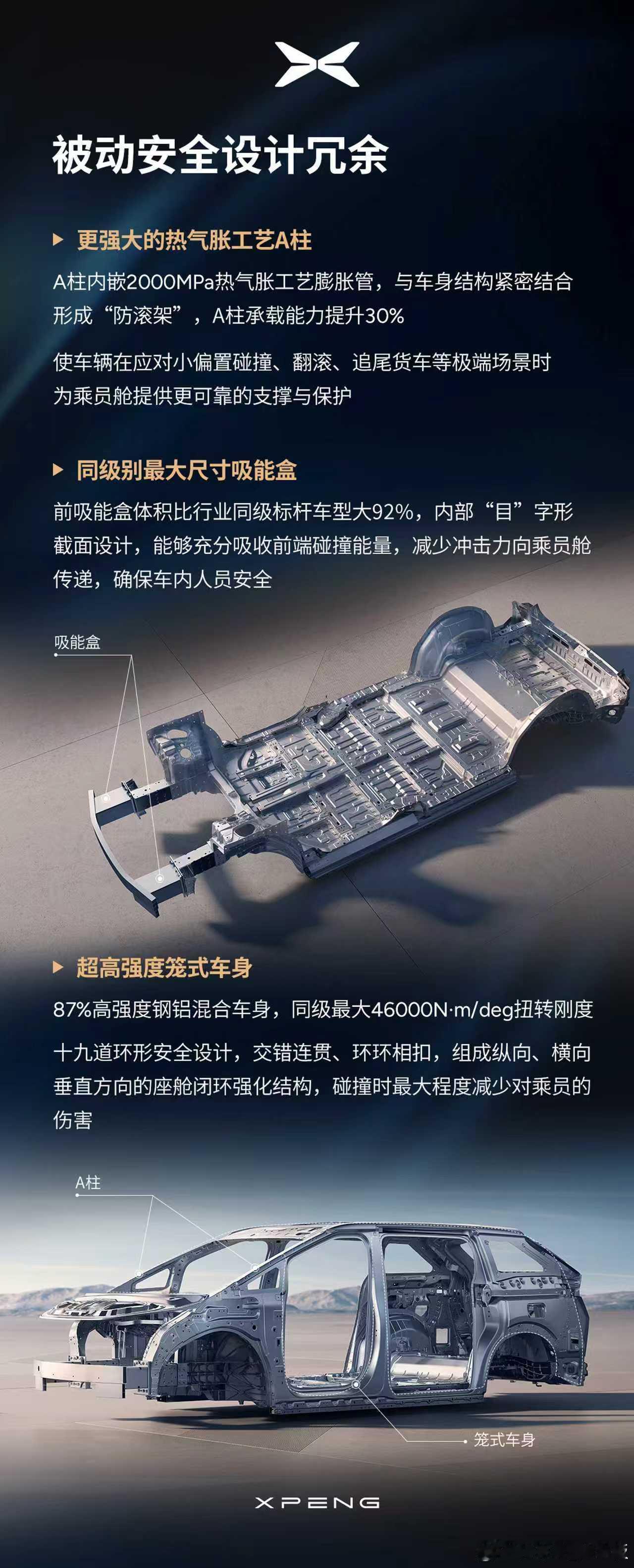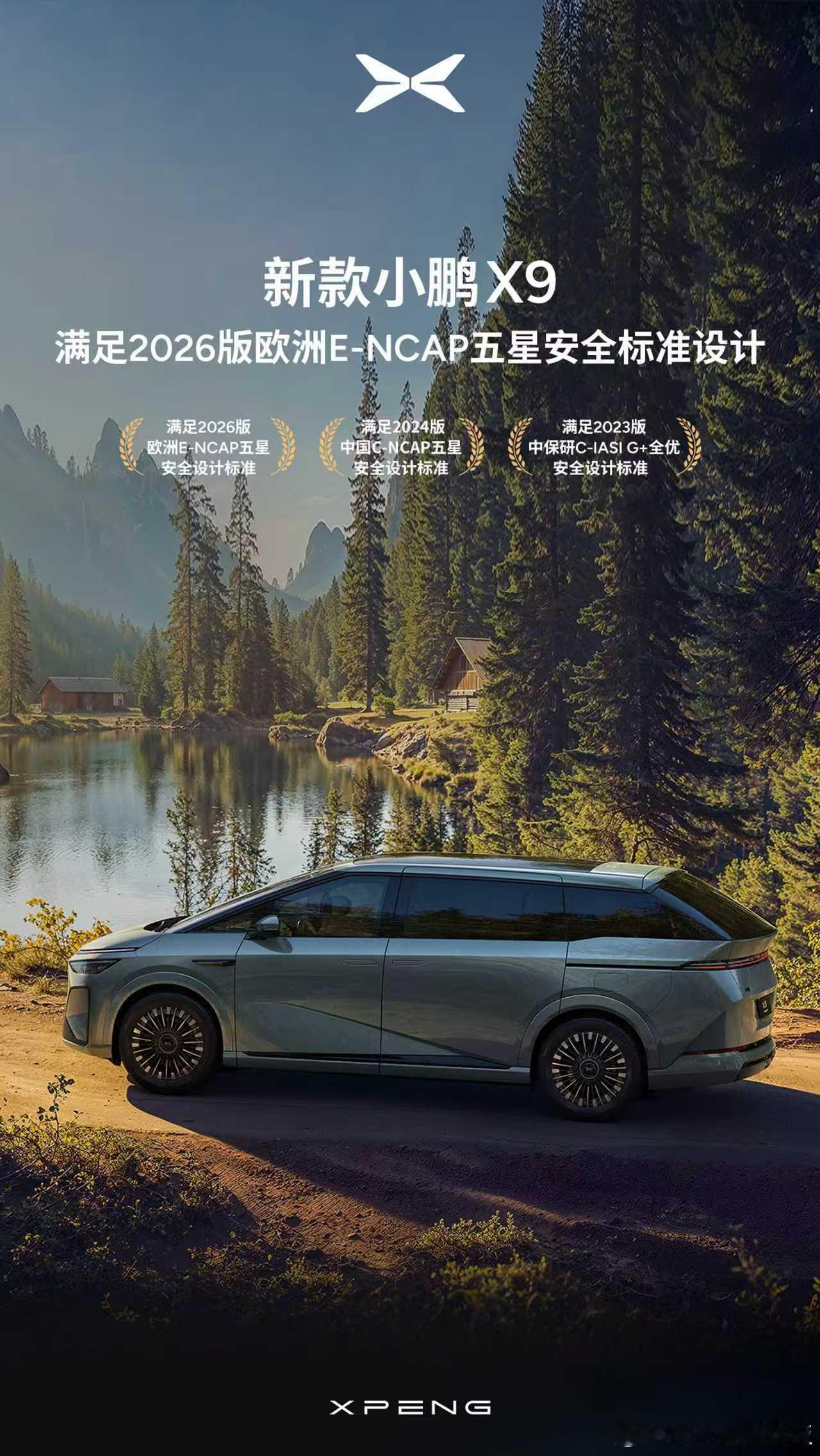 小鹏X9超级增程安全标准严苛,满足2024版C-NCAP五星安全、2023版中保研G+全优设计标准,2026版欧洲最高安全法规E-NCAP安全设计标准。