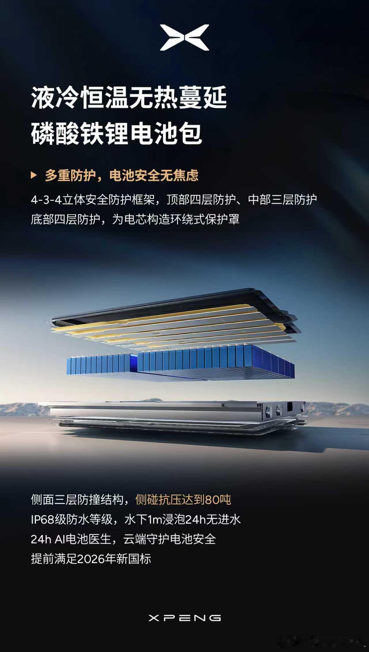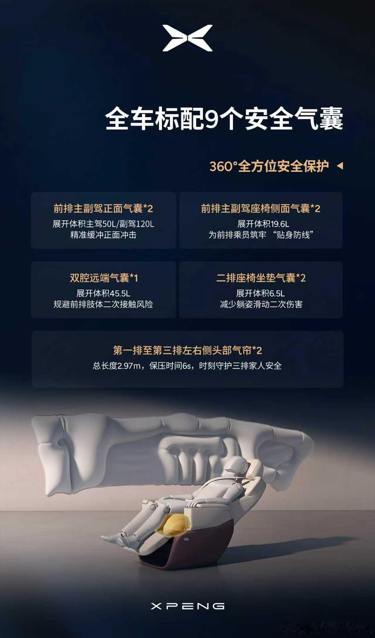 全车标配 9 个安全气囊,搭配液冷恒温无热蔓延磷酸铁锂电池包 + 4-3-4 立体防护 + IP68级防水 + AI 24h 电池医生+提前满足 2026 新国标,全域守护乘员安全。新款小鹏X9安全设计满足26版欧洲五星1602公里续航的小鹏X9超级增程来了