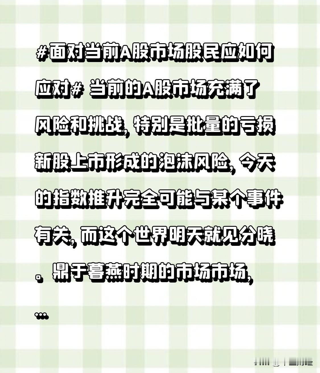 当前的A股市场充满了风险和挑战,特别是批量的亏损新股上市形成的泡沫风险,今天的指数推升完全可能与某个事件有关,而这个世界明天就见分晓。 鼎于暮燕时期的市场市场,更多的需要一个等待或者一个战略观望!