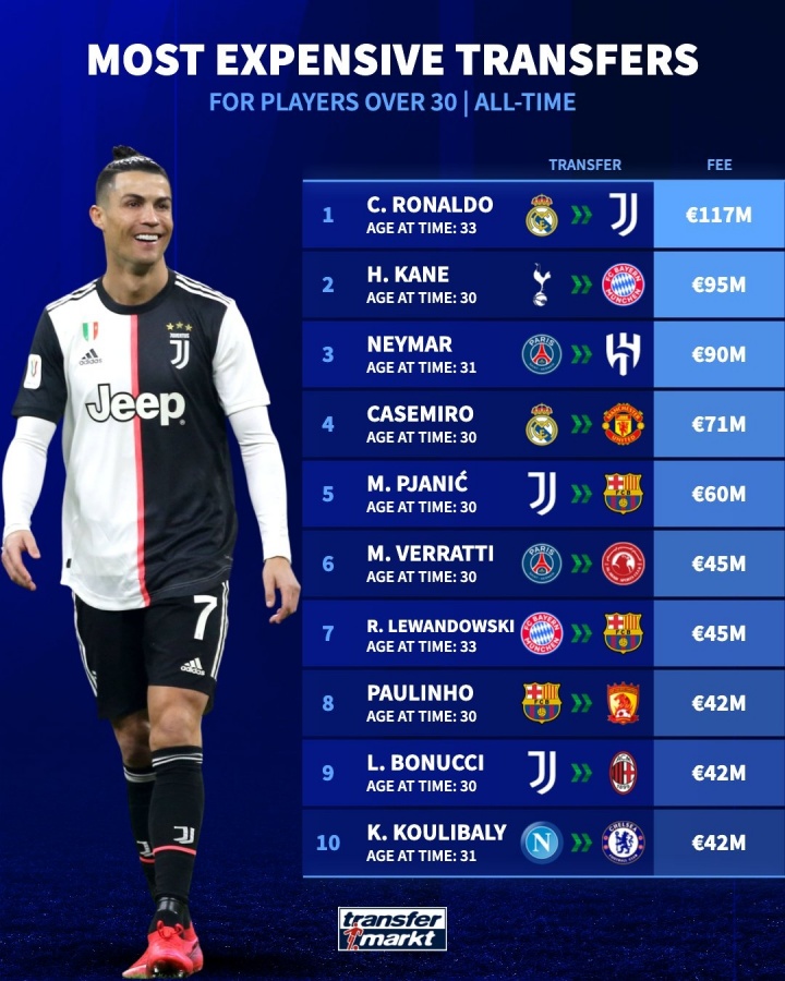 直播吧10月29日讯德转盘点了足坛历史30岁及以上球员转会费纪录榜,其中C罗33岁加盟尤文以1.17亿欧居首,凯恩加盟拜仁次席,内马尔9000万欧第三。