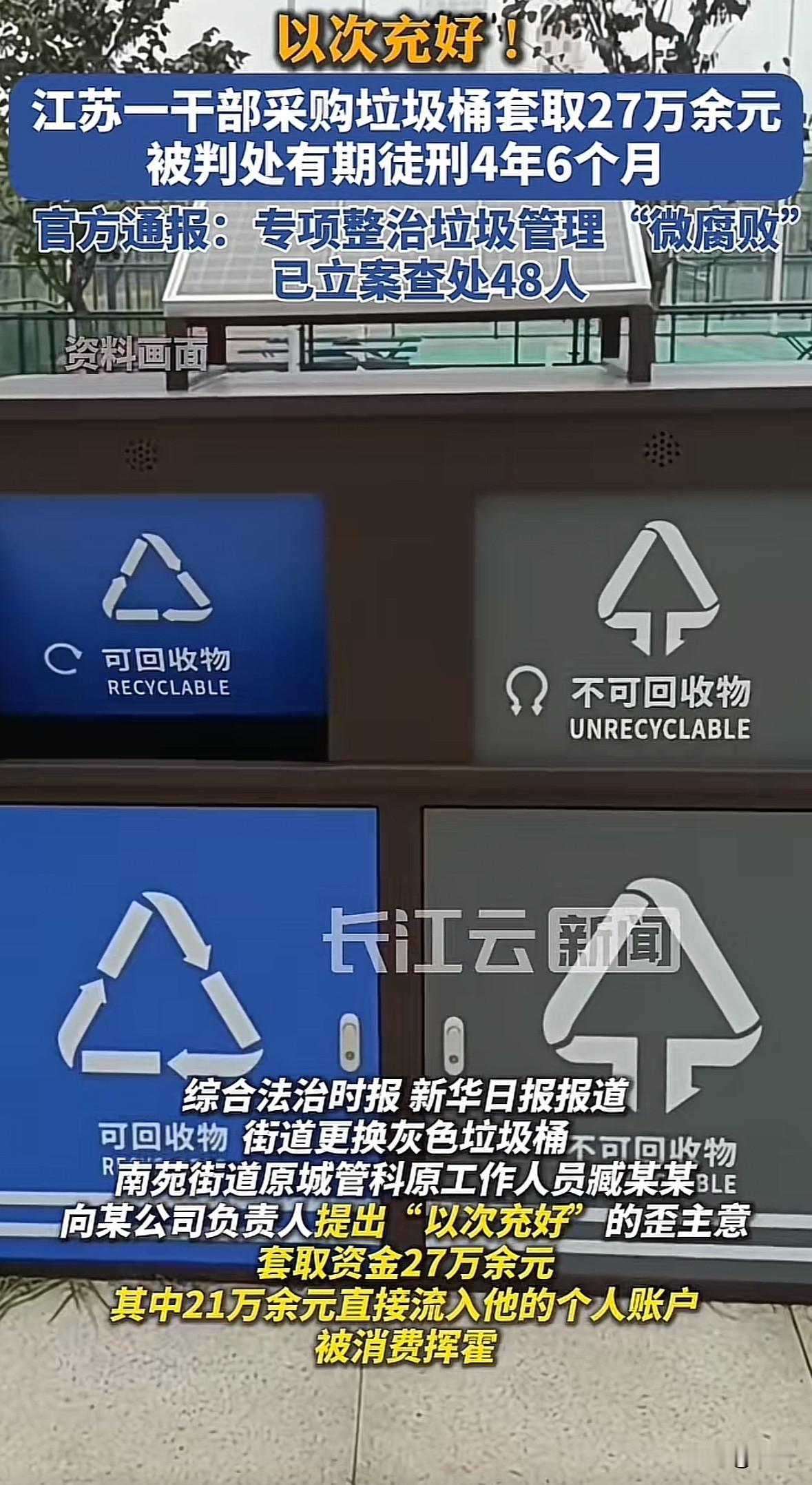 南京建邺区南苑街道城管办原工作人员臧维钧,2019到2023年利用垃圾桶采购、垃圾亭房建设职权,提议合作公司以次充好,套取27万余元,其中21万多进了自己腰包挥霍,还收好处帮公司结款。 2024年8月他被查,11月因贪污罪、受贿罪判四年六个月。这案子揪出后,当地查垃圾管理领域乱象,紧盯资金使用等关键处,到2025年10月底已立案48人。 现在奖补资金进了“阳光惠民平台”,全程公开。基层“蚁贪”看着事小,贪的是公款,伤的是民心。这种紧盯民生小事的整治,把流程摆阳光下,才是真的护好老百姓的钱袋子。
