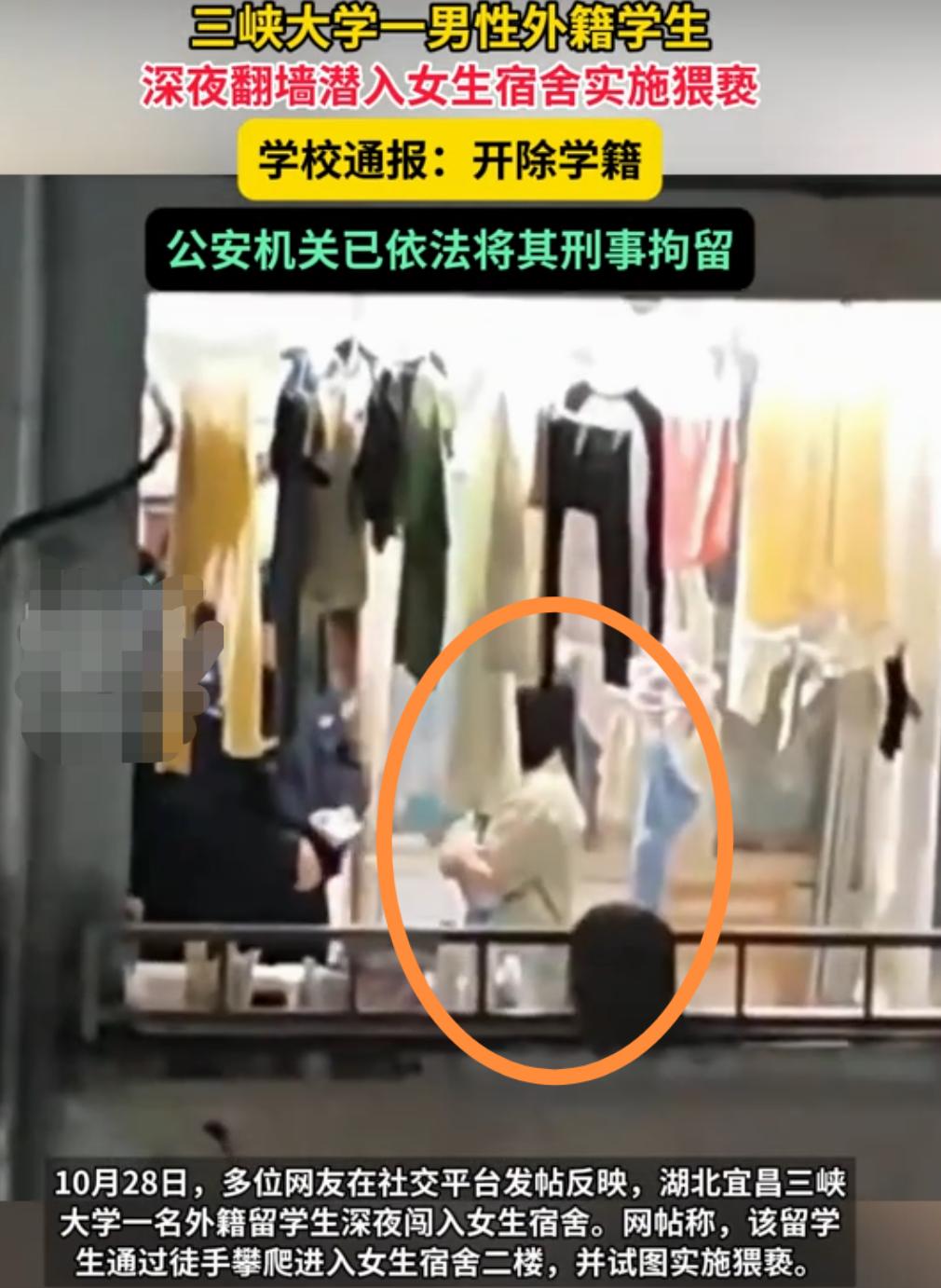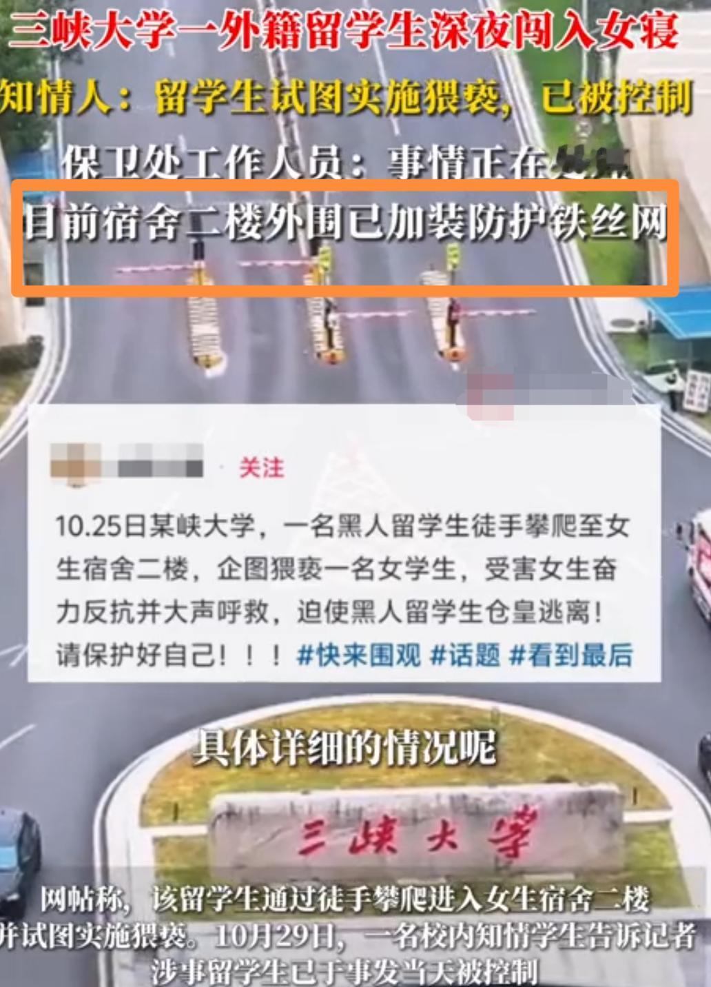 三峡大学对外籍留学生深夜闯入女生寝室试图猥亵一事出了通报,涉事留学生当天被抓到,学籍被开并刑事拘留。 但没有公布留学生的国籍,网传是黑人,三峡大学位于湖北宜昌,一本大学,高考填志愿时了解过,留学生有三四百人,多来自南亚。 推测要么是阿三,要么是大巴,这名留学生是凌晨三点左右,徒手攀爬至女生宿舍二楼,胆子是真大。 据说是摸了女生的头,受害女生奋力反抗,双方有交手,最终女生武力值不敌脸部有受伤,跑出宿舍并大声呼救。 对方见状不妙才仓皇逃离,除了这事,该校女生还曝料,以前宿舍有丢失内衣的情况,没当回事,现想想就后怕。 现在的外国留学生没什么含金量,中专都有了,像行径这样恶劣的留学生服完刑用应该驱逐出境。 除此之外,学校方管理也有失职渎职责任,要通报给全国所有招有留学生的大学,以引起警示教育作用。 留学生那点事 黑人留学生