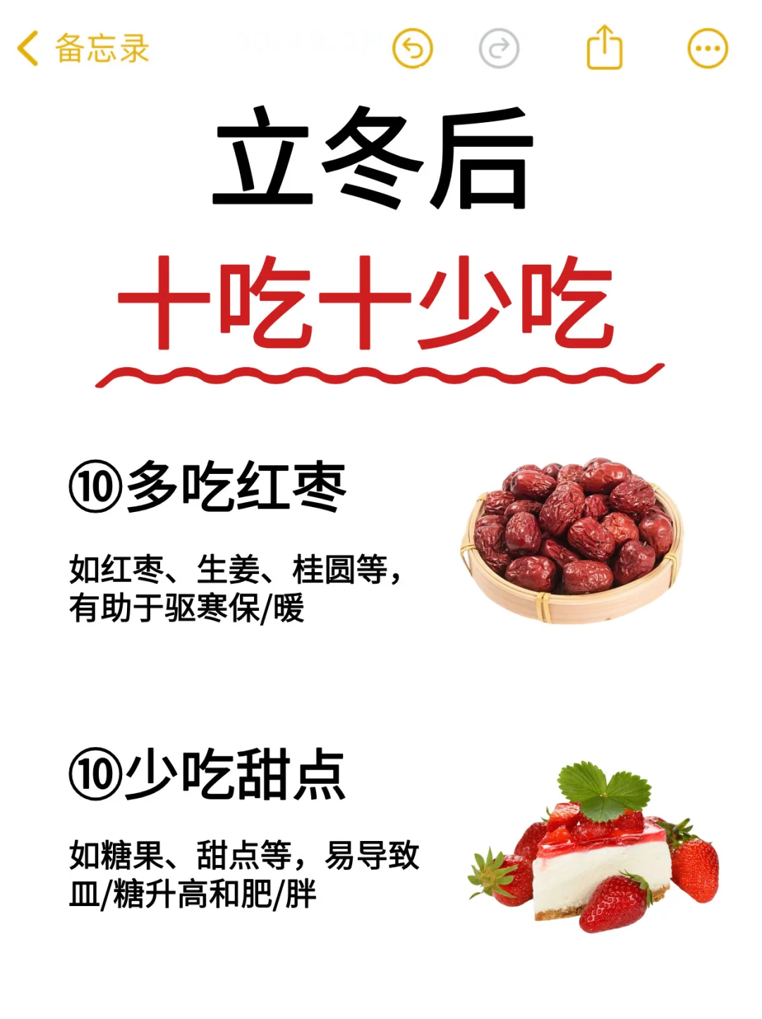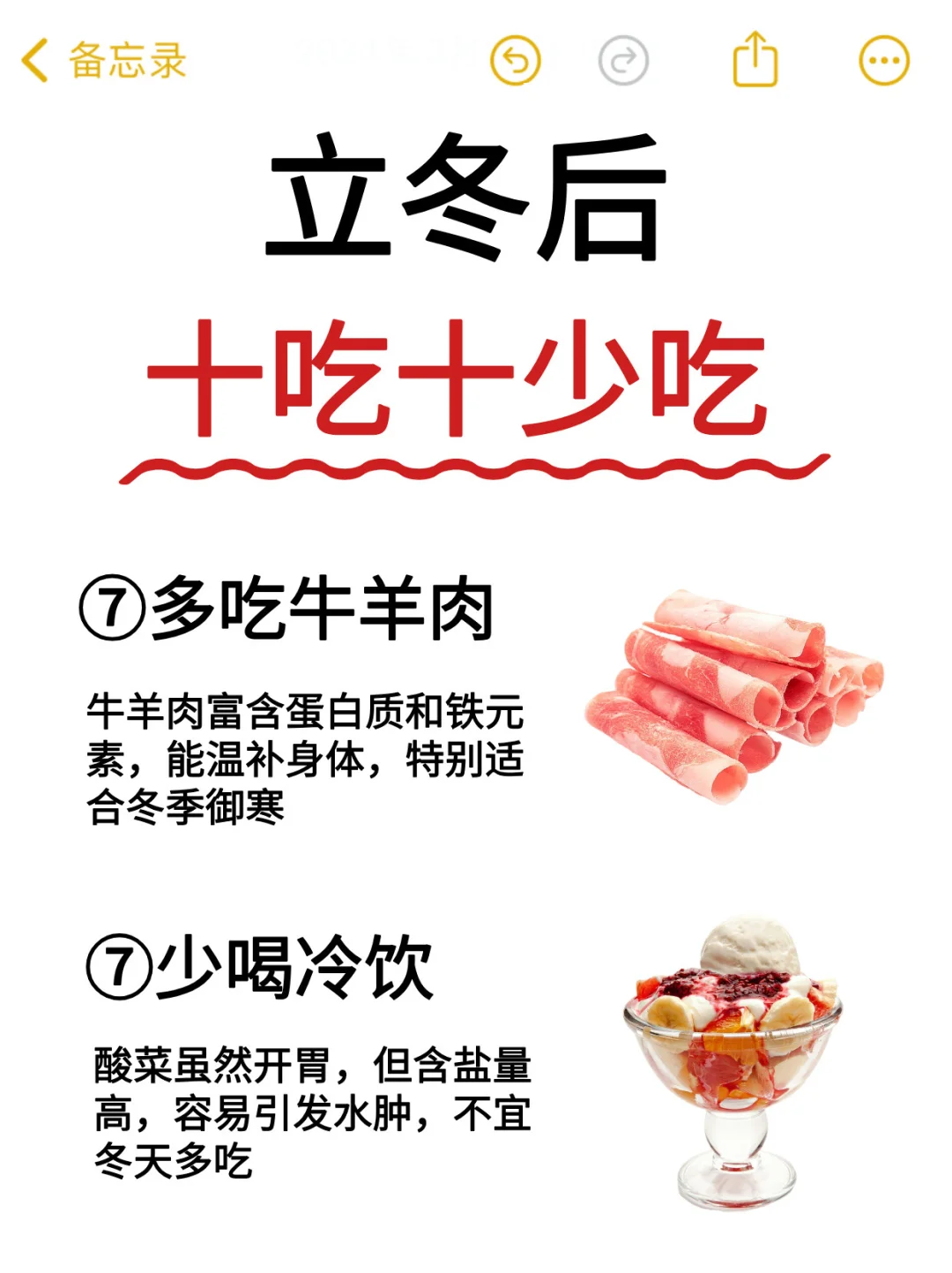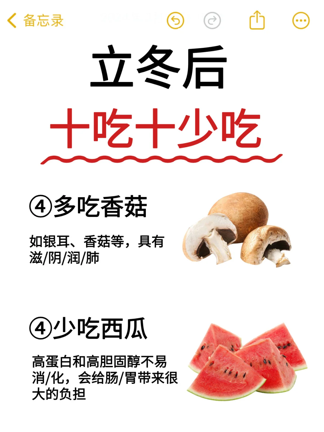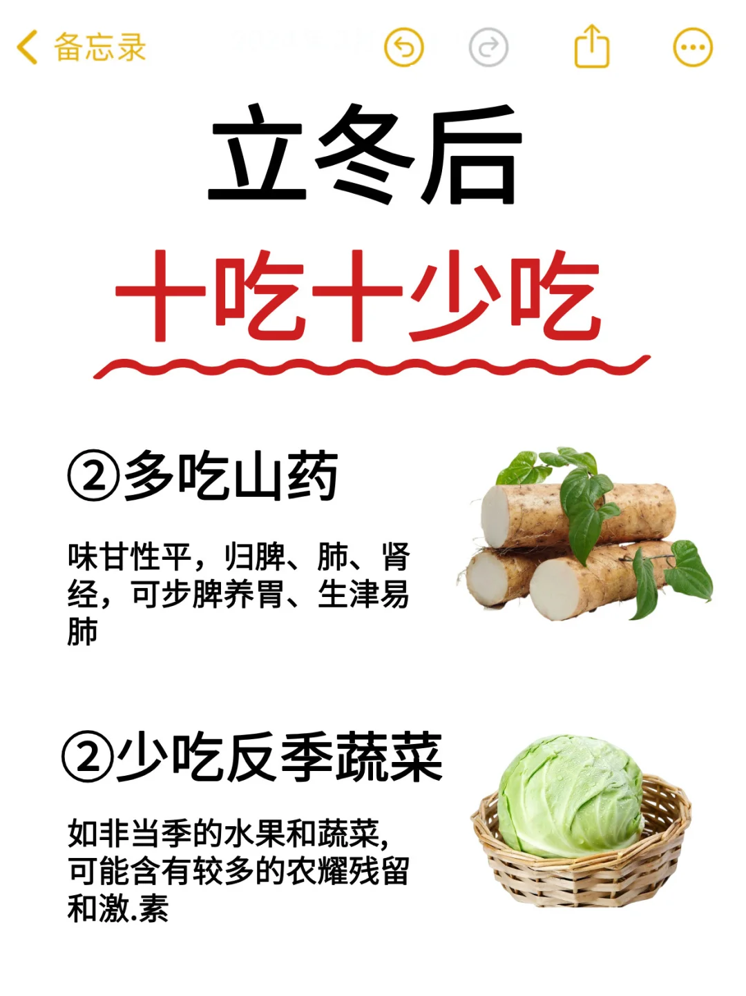 立冬养生重在“藏”和“补” 要如何吃才能更好的养护?孟姐已帮薯宝们整理好,建议收藏 · 😋牢记多吃 1.苹果 2.山药 3.龙眼 4.香菇 5.银耳 6.白萝卜 7.牛羊肉 8.菠菜 9.豆浆 10.红枣 · 😋牢记少吃 1.内脏 2.反季蔬菜 3.螃蟹 4.西瓜🍉 5.年糕 6.酸菜 7.冷饮 8.油炸食品 9.咸菜 10.甜点