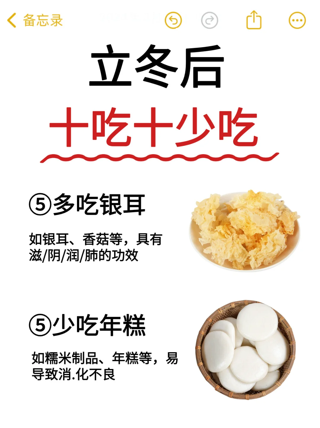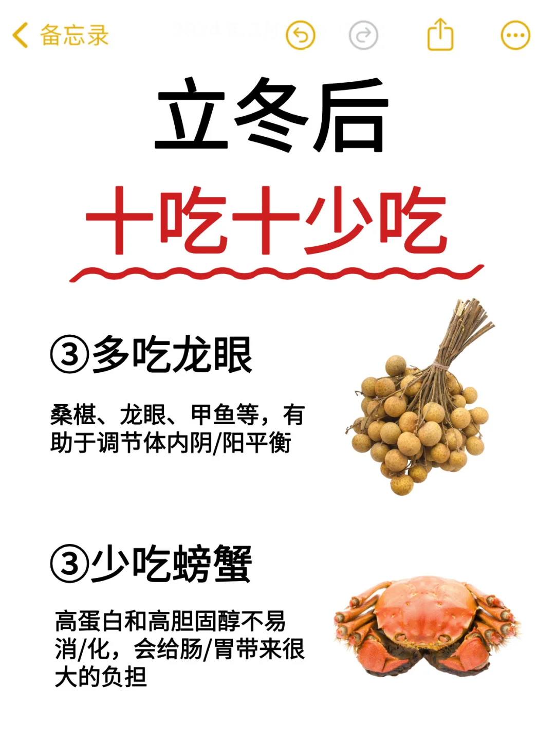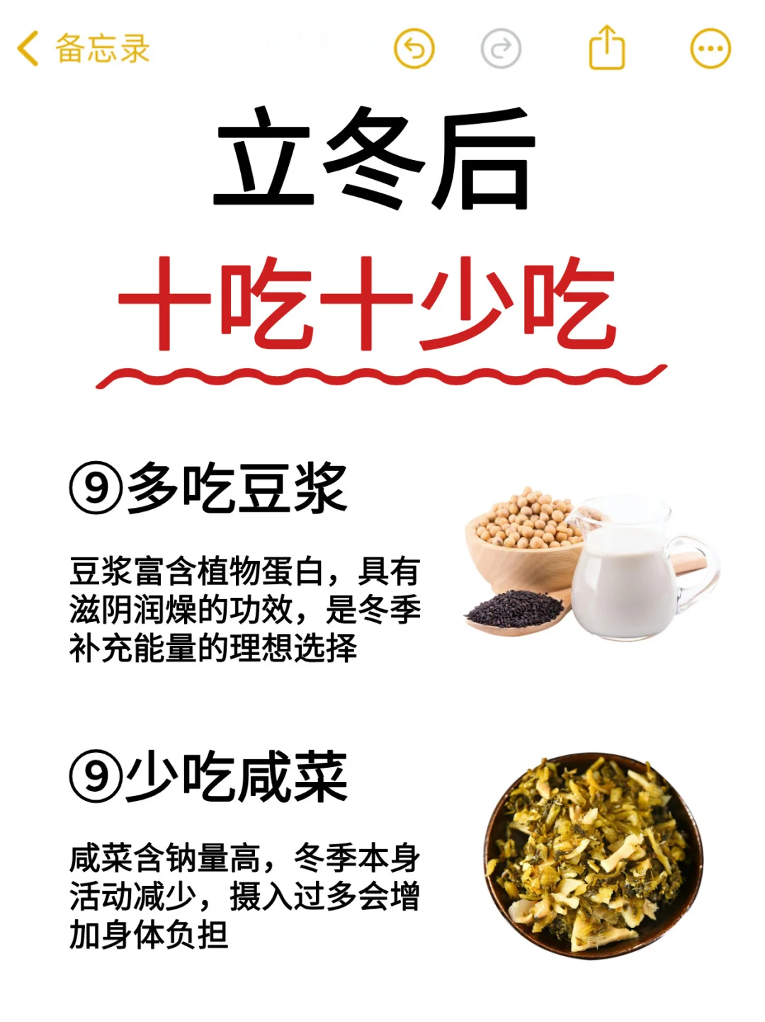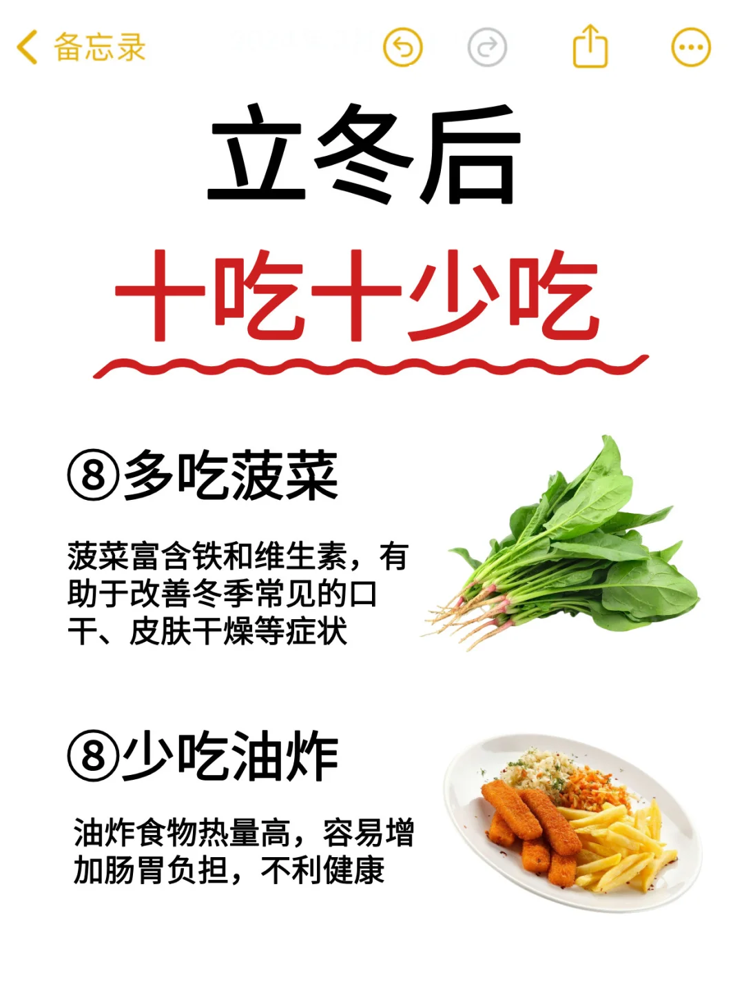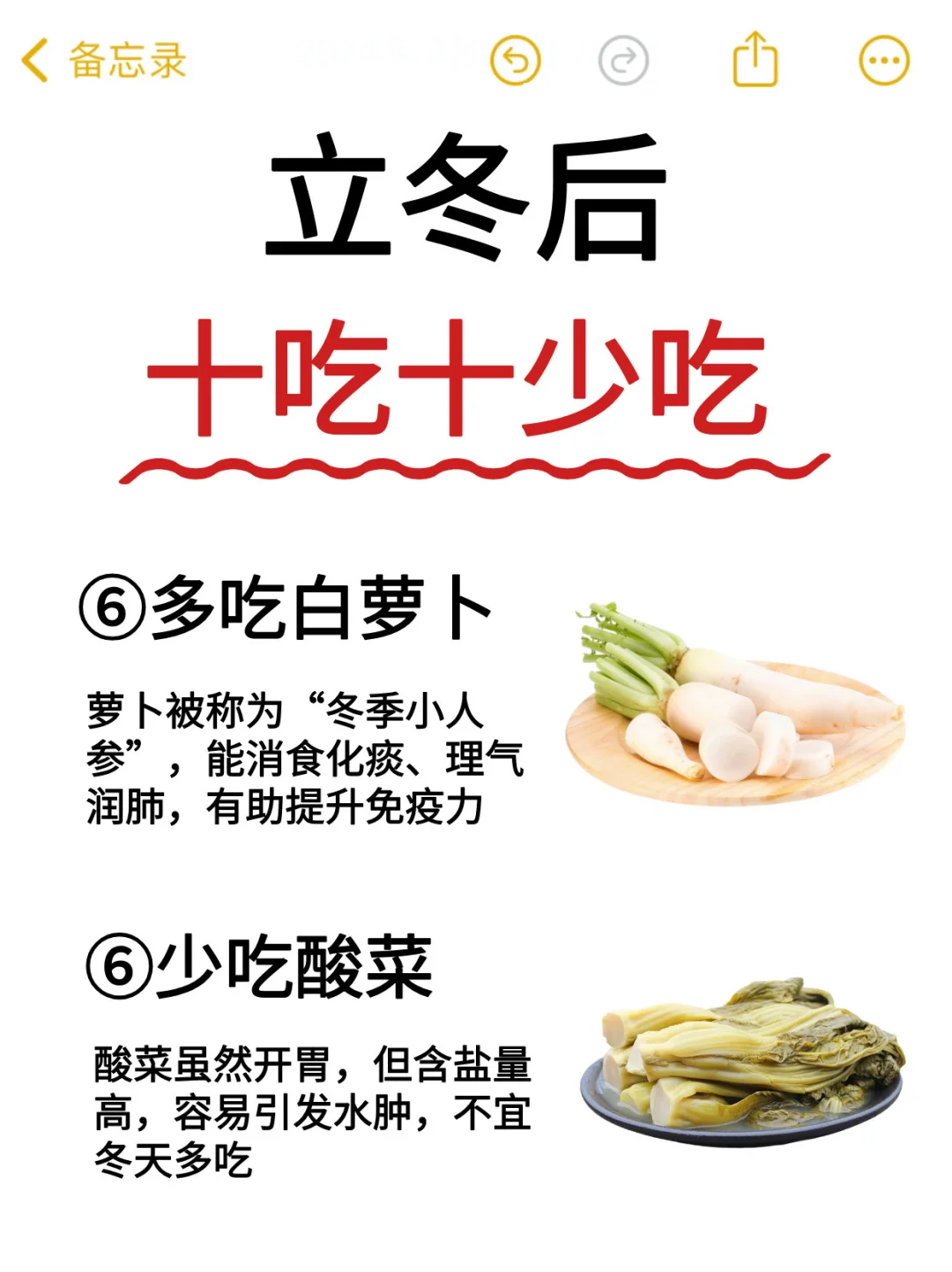 立冬养生重在“藏”和“补” 要如何吃才能更好的养护?孟姐已帮薯宝们整理好,建议收藏 · 😋牢记多吃 1.苹果 2.山药 3.龙眼 4.香菇 5.银耳 6.白萝卜 7.牛羊肉 8.菠菜 9.豆浆 10.红枣 · 😋牢记少吃 1.内脏 2.反季蔬菜 3.螃蟹 4.西瓜🍉 5.年糕 6.酸菜 7.冷饮 8.油炸食品 9.咸菜 10.甜点