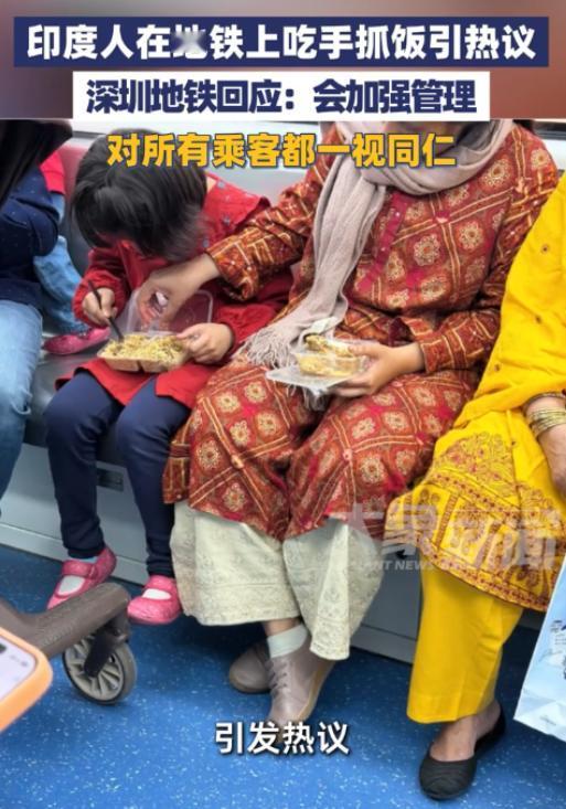 “太无语了”,深圳,两名印度人坐地铁时,直接吃起了手抓饭,有人上前劝阻,却被对方无视,反而吃得津津有味: 深圳地铁一直都有“禁止饮食”的规定,这些年大家都互相监督,互相遵守,但偏偏两个印度人打破了这个默契。 当时,一位印度大妈带着一个孩子坐地铁,当时两人手里都是拎着炒饭的,本以为他们是带回家吃,结果列车一发动,车厢内就飘来了饭菜味。 两个印度人直接打开了炒饭盒子,当着众人的面徒手抓饭吃,如果这个举动是在地铁之外,没人会说什么,但地铁内都是明文规定除婴幼儿外,不能饮食。 刚开始大家用眼神提醒她们,但两人似乎没看懂别人的警告,根本没打算把食物盖上,后来有人实在看不下去,站出来提醒地铁内不让吃东西。 结果大妈只抬头看了一眼,又低头自顾自地吃起来,不知道是听不懂中文,还是故意为之。 最后有网友将此视频发布到网上,随着大家的不满情绪越来越大,地铁工作人员也出来解释:“对所有乘客都一视同仁,不会因为是外国人不管。” 当时工作人员也有看到这俩印度人,但巡逻的时候她们并没有打开食物,如果看到她们吃的话,一定会一视同仁上前去阻止。 说实话,大家反感这种行为,一方面是我们自己遵守的规则,到印度人这里反倒被无视了,另一方面是她们“手抓饭”吃完后如果手到处摸,很容易给其他乘客带来不便。 而对于这类人,即便没有当场发现,后续可以通过监控找到他们,即便是口头的教育都要让他们知道,这样做是错误的,是令人厌恶的!