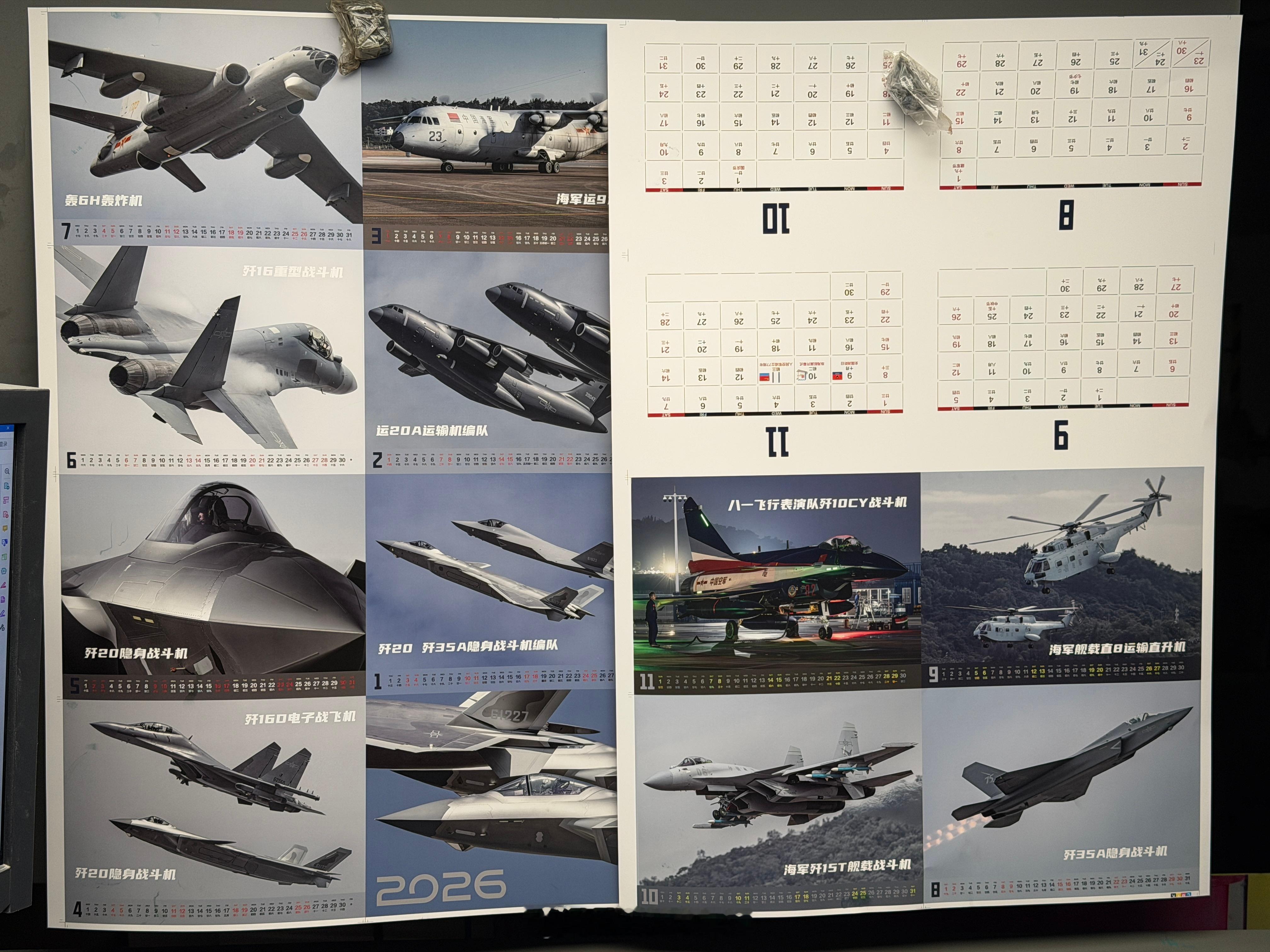 从2017年开始每年做一本台历,今年最大的不一样就是第一次有了海军航空兵机型,估计2028年的台历上能看见歼36和歼50了