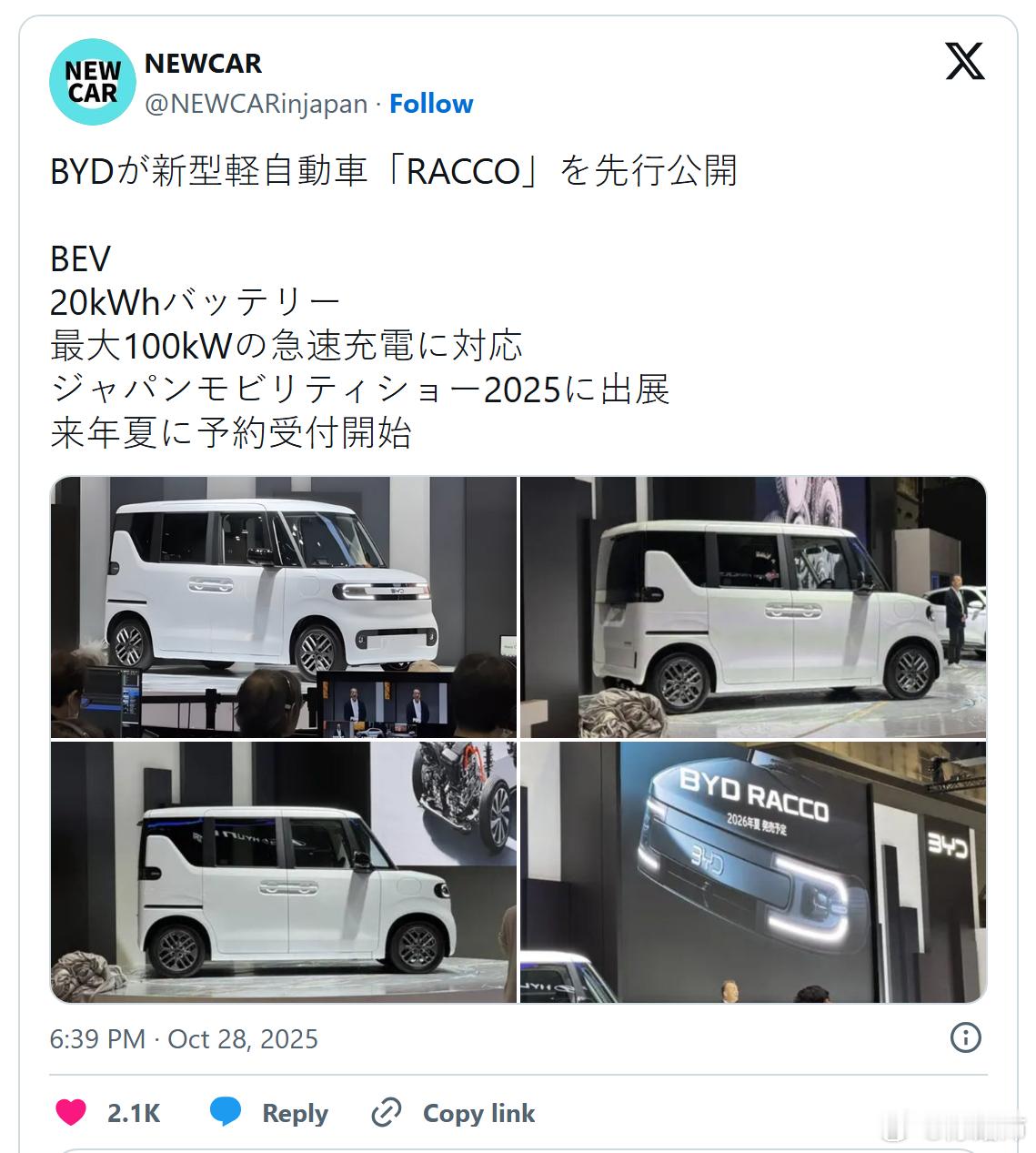 不愧是比亚迪啊!他们在东京车展亮相了Racco,完全符合日本K-car标准的一台小车,所以动力只有63马力,装备20度电池,续航(据说是WLTC标准)180公里。