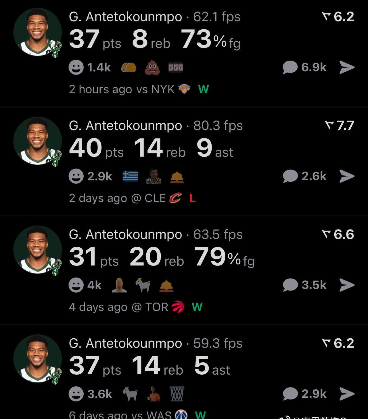 字母哥成为NBA历史上首位开赛前四场比赛拿到145分50个篮板和28次助攻的球员。得分最多的是76人的马克西150。 37分14板5助(尼克斯111-121雄鹿) 31分20板7助(雄鹿113-118骑士) 40分14板9助(雄鹿122-116猛龙) 37分8板7助(奇才120-133雄鹿)
