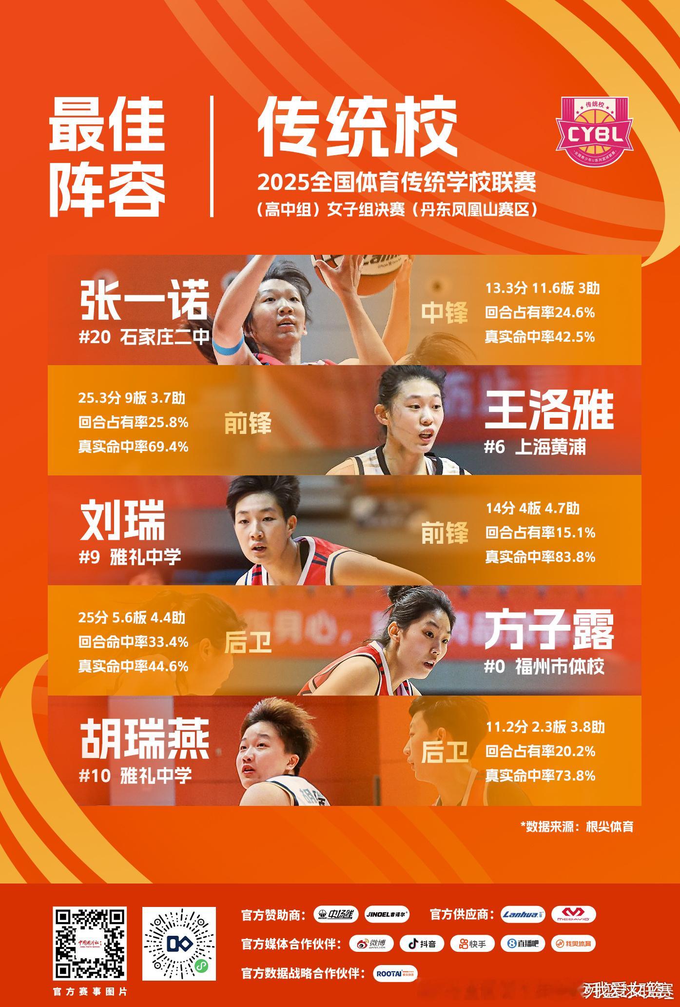 【传统校篮球联赛最佳阵容揭晓】10月25日下午,2025全国体育传统学校篮球联赛女子组在丹东圆满收官,雅礼中学以全胜战绩成功卫冕,彰显强劲实力。在今天下午公布了高中女子组决赛最佳阵容,刘瑞(雅礼中学)、胡瑞燕(雅礼中学)、方子露(福州市体校)、王洛雅(上海黄浦)、张一诺(石家庄二中)五位球员入选。