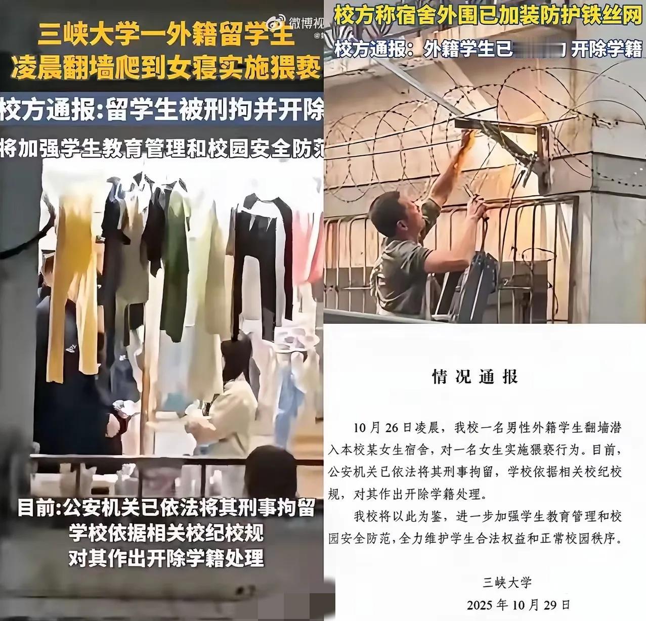 现在最头疼的应该是三峡大学校长吧 没想到堂堂一211高校,居然被一个黑人留学生全毁了! 就因为留学生公寓和女生宿舍相邻,一名黑人留学生却打起了歪主意,大半夜爬到女生宿舍二楼意图不轨,好在受害女生及时惊醒反抗,跑出宿舍呼救才吓跑嫌疑人,并在宿管阿姨的帮助下报了警。 关键是早有端倪!学生说之前丢内衣、被骚扰的事就没断过,校方压根没当回事。更让人寒心的是,出事先想着解散群、封消息,四天后才迫于压力回应。 大家怒的从来不是留学生身份,是那种为了“国际化”搞优待、管理却“软趴趴”的双标。国际化哪是花钱买人数?把本校学生的安全感放第一位,才配叫名校。 你觉得高校搞国际化,该怎么平衡面子和学生安全?来聊聊~三峡医专 三峡附属学院 黑人高校