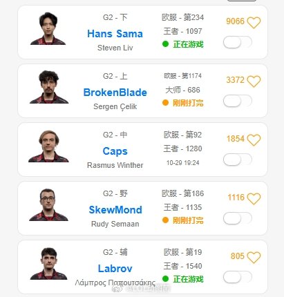 英雄联盟S15八强赛进行中,根据排位小程序查询今日G2选手疑似没有约上训练赛,下午到现在一直在峡谷之巅进行排位。