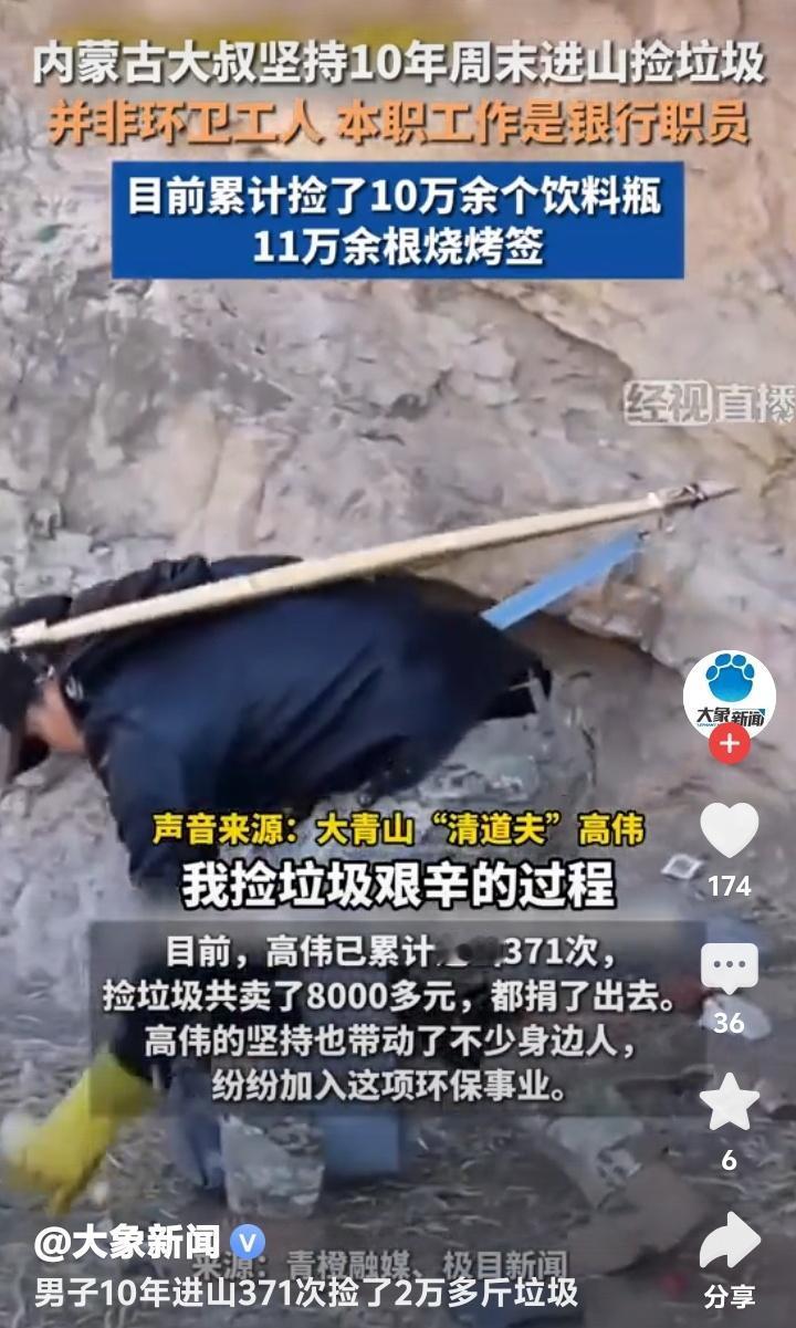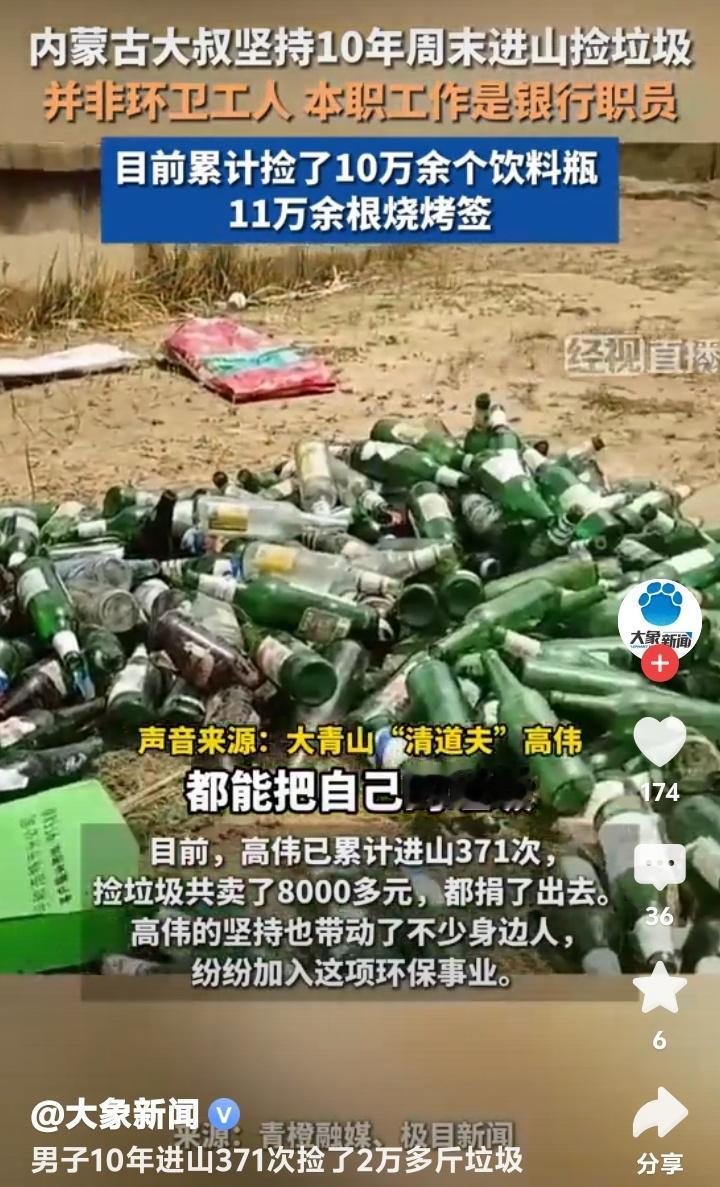 内蒙古银行职员十年秘密行动曝光!每周潜入深山捡拾2万斤垃圾,卖废品所得竟全部做了这件事…… 当你趁着周末在商场闲逛时,有人正背着麻袋在崎岖山路上艰难前行。当你喝着奶茶刷着手机时,有人正徒手从荆棘丛中抠出腐烂的塑料包装。这位看似普通的银行职员,用十年时间完成了一场令人震撼的“秘密行动”。 呼和浩特的大青山深处,每个周末都会出现一个特殊的身影。他不是游客,不是护林员,而是背着十几个麻袋的“垃圾猎人”。十年间,371次进山,累计行程可绕地球半圈,这位银行职员高伟用双手捡起了相当于一头成年大象重量的垃圾。 第一次进山的情景至今历历在目。原本想欣赏秋日层林尽染的美景,却被漫山遍野的塑料瓶刺痛双眼。烧烤签像利剑般插在草地上,食品包装袋在风中打着旋儿。那一刻,他做出了改变余生的重要决定:要用自己的方式守护这片青山。 清晨五点,当大多数人还在梦乡,高伟已经整装待发。他的行囊里没有美食,没有娱乐设备,只有叠得整整齐齐的麻袋和手套。山路崎岖,有时为了捡一个卡在石缝中的瓶子,他要匍匐前进;有时为了清理悬崖边的垃圾,他要系上安全绳。这些惊险瞬间,他从未向家人提起。 十年坚持,他摸索出一套独特的“清山秘籍”。哪个季节哪个区域垃圾最多,哪些垃圾最难清理,他都了如指掌。夏季烧烤季后的山坡总是重灾区,节假日后的溪流边总漂浮着包装袋。他的清理路线图,俨然成为这座山的“病历本”。 令人惊讶的是,这些看似无用的垃圾,在高伟手中变成了希望的火种。十年间,他卖废品所得八千余元,全部捐给了需要帮助的人。这笔钱资助了两个孩子的学业,为山村小学添置了图书。那些被丢弃的塑料瓶,就这样完成了从污染源到助学金的华丽转身。 最初,同事们都觉得他“不正常”。银行工作稳定体面,何苦每个周末把自己弄得灰头土脸?面对质疑,高伟只是微笑。他相信,真正的体面不是衣着光鲜,而是内心纯净。渐渐地,他的行动感染了身边的人,一支特殊的“清山小队”悄然成立。 如今,这支队伍不断扩大。有带着孩子来体验的家长,有相约而来的大学生,甚至还有曾经乱扔垃圾的游客。每次进山,他们就像移动的环保课堂,用行动向来往的游客传递着无声的警示。 更令人欣慰的是,大青山正在发生微妙变化。垃圾明显少了,自觉带垃圾下山的游客多了。有时高伟会发现,某些经常清理的区域已经连续几个月保持干净。这种改变,比任何数据都让他欣慰。 在这个快节奏的时代,有人用十年时间追逐名利,有人用十年时间积累财富,而高伟用十年时间守护着很多人视而不见的青山绿水。他的故事让我们思考:所谓成功,是否还有另一种定义?所谓人生价值,是否能在服务社会中得到更好体现? 当我们还在为生活中的琐事烦恼时,这位普通的银行职员已经用最朴素的方式,书写了不平凡的人生篇章。他的故事像一面镜子,照出了这个时代的缺失,也映出了每个人内心深处的善念。 也许下一个周末,当你走向山林时,也可以多带一个垃圾袋。因为守护我们共同的家园,从来都不该是一个人的战斗。让我们跟随高伟的脚步,在绿水青山间,找到属于这个时代最动人的答案。 (来源:青橙融媒、极目新闻、大象新闻等媒体报道)