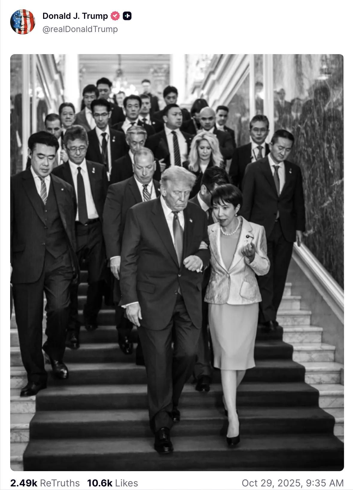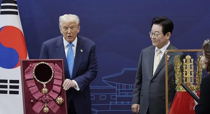 韩国和日本两个国家看的透透的。 确实不一般,这特朗普日本韩国之行,真的是欲哭无泪啊。 这完全是狗腿子看到自己的主人,舔着脸就往上凑。 日本新上任的首相真的是卑微屈膝,根本就没有任何尊严,不说在与特朗普检阅部队的时候,头都没有对日本的国旗鞠躬敬礼,直接略过,反之后面的高市早苗震惊的张开了下巴。 更搞笑的是,高市早苗就连开会都迟到了,并且在会上解释,自称和特朗普在房间内在看棒球,看起来了很是开心,在会上还讨论起棒球的比赛成绩,实在是搞笑,这完全是特朗普给的下马威啊。 如此都能够忍让,不得不佩服啊, 眼瞅着结束了日本之行,来到了韩国,也是特朗普韩国的最后一站,韩国总统李在明也是为这强势的总统准备了一份大礼,竟然是一顶金皇冠的复制品,讲述这皇冠的意义是“天上和地上的领导之间的神圣联系。” 看得出这就是韩国在向美国确认自己的立场,铁了心要做仆人了啊,对此你们怎么看?