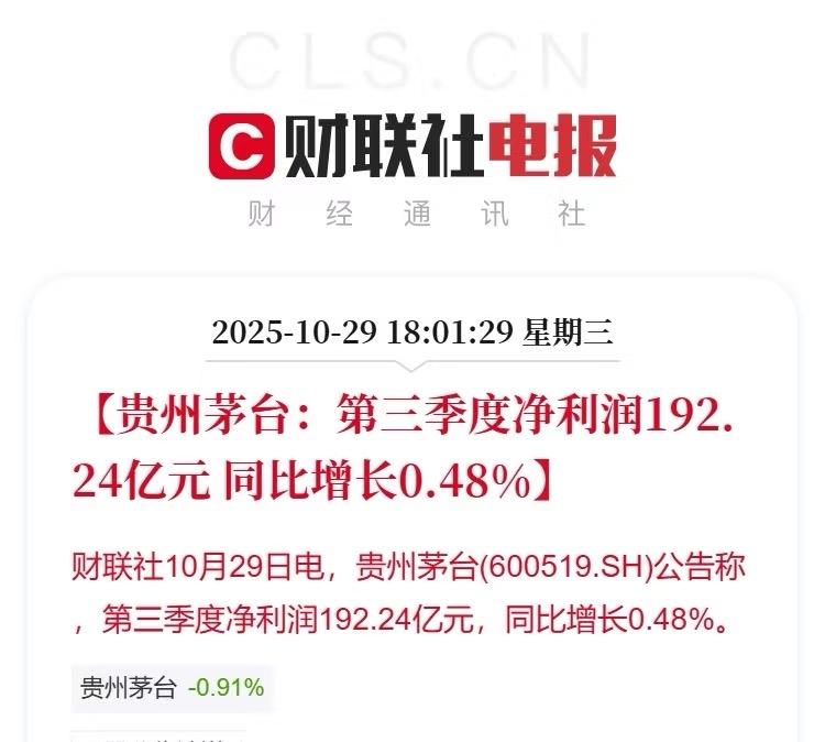 贵州茅台第三季度净利润192.24亿元。 早就说了,茅台所有的持有理由,是基于它能维持增长的基础上的,如果他增速不变甚至增速没有,那就有大麻烦了。