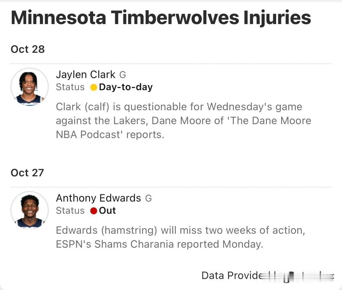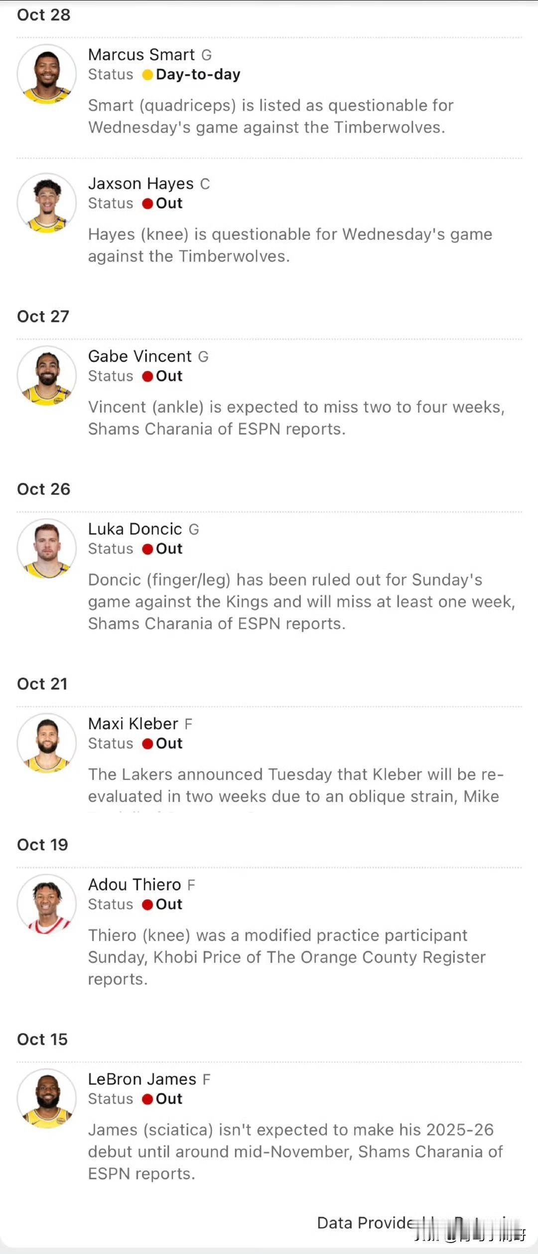 湖人vs森林狼比赛预告!!!湖人客场对阵森林狼,湖人被看衰! 北京时间10月30日,上午9点30分,湖人将在明尼苏达做客,挑战自己的软肋森林狼,目前湖人全队已经乘机抵达,这场全美直播的比赛备受关注。 目前ESPN给出的比赛预测中,湖人胜率不足3成,而森林狼高达7成以上,湖人完全被看衰,这还是缘由于他们自己在明尼苏达不堪的过去。 本场比赛,詹姆斯、东契奇和文森特确定缺阵,而斯玛特和海斯预计是可以打的。 森林狼方面,当家球星华子缺席比赛,按说华子不在,湖人的希望应该不至于三成都不到。 目前又是一场苦战,里夫斯还会继续爆发吗,没办法湖人现在就看他和艾顿了,里夫斯更多的会主导进攻,期待明天的表现。 湖人阵容名单 湖人阵容里夫斯 湖人